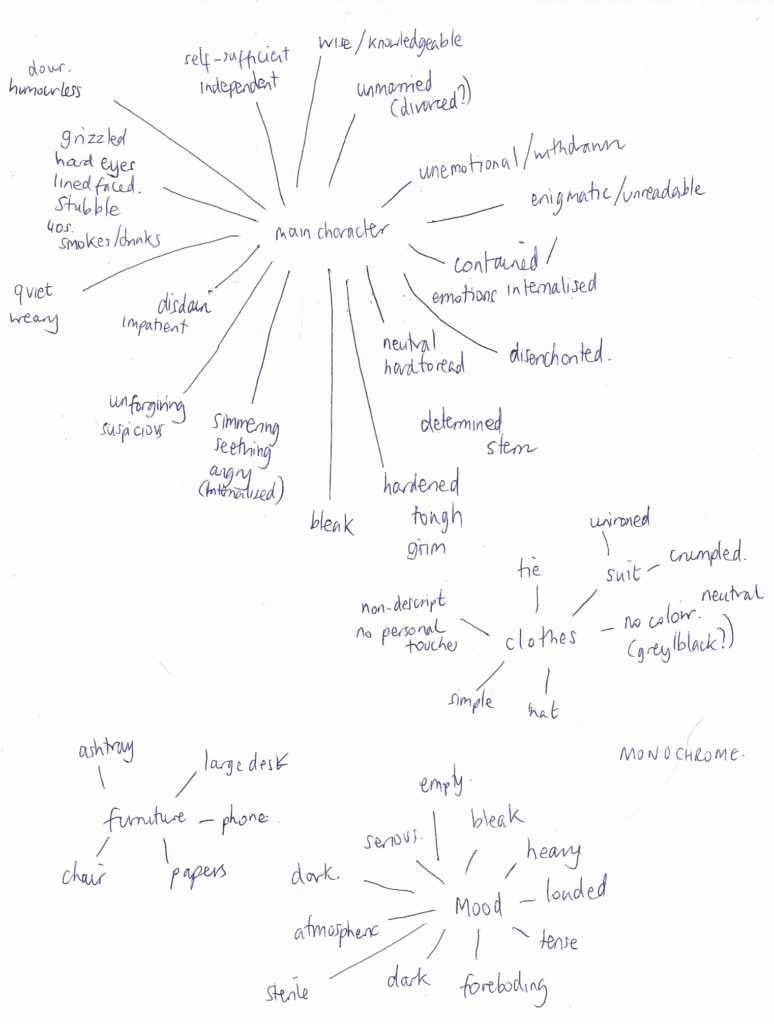 The word I chose for the overall mood I inferred from reading the extract, and inspired the above choices, was ‘grim’. The man has a grim job during a grim period in, at that time, a grim city. I did not feel that the use of much colour would be appropriate. As the photographs from this time was mostly black and white, I thought this would influence my choices as well.
