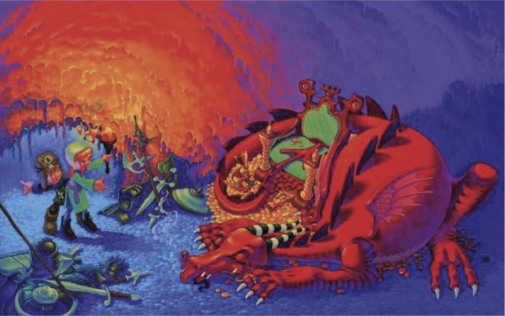 The most detailed elements of the illustration are the characters (including the dragon) the treasure and the discarded armour/weapons. I would suspect this is due to these being the most important elements in the image and thus what the viewer is being encouraged to look at. In terms of texture in the illustration, the most noticeable elements to me were the floor of the cave, the lit up area on the cave wall and also the coins, which the dragon is on top of. I was quite surprised that most of the dragon’s body was smooth in texture, rather than being scaly, but then I thought that perhaps this would be ‘overkill’ in terms of the texture as it would be similar to that of the floor and coins.