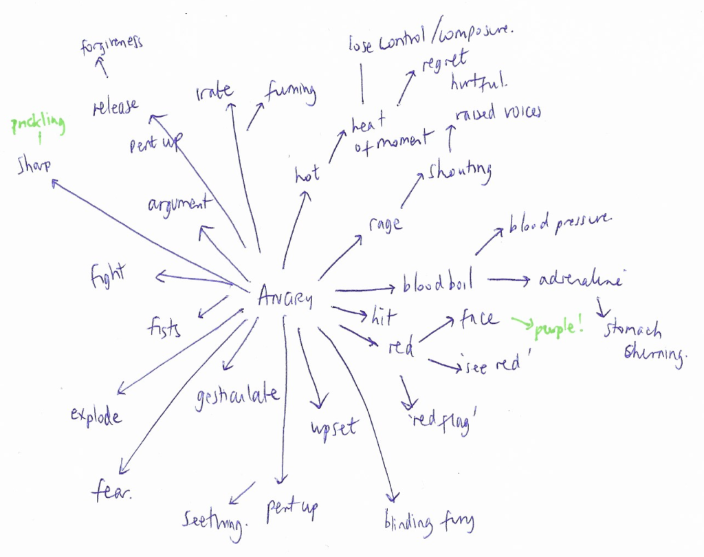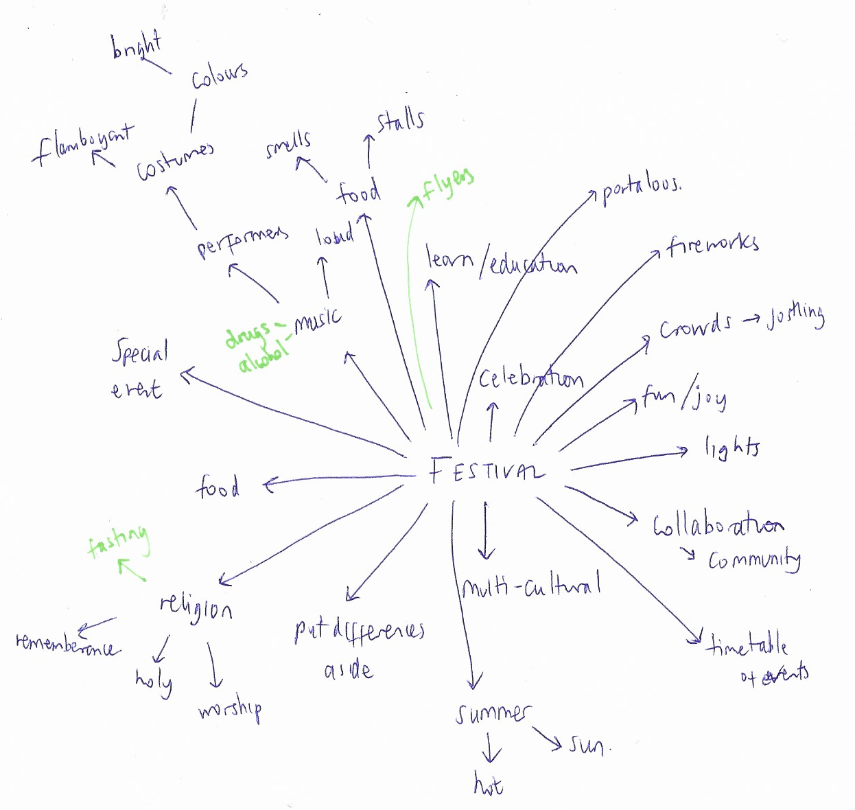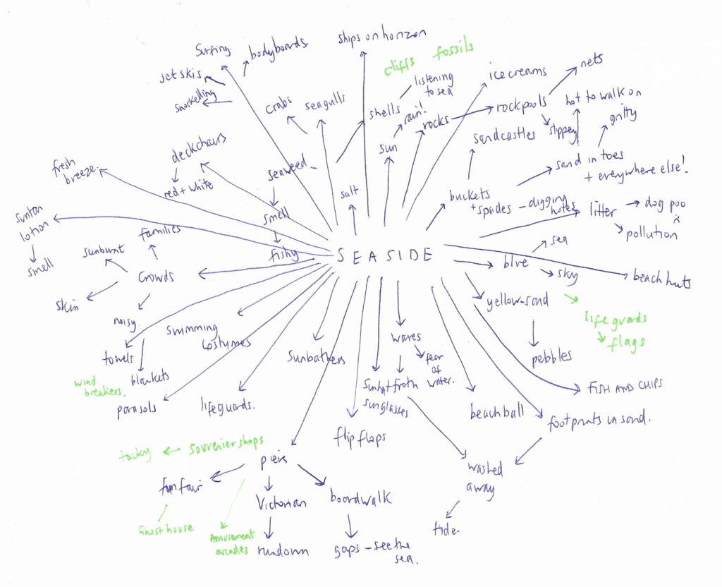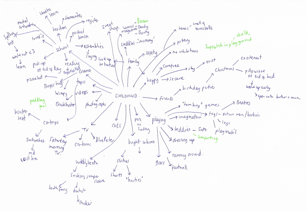 The word I found most difficult to work with was ‘festival‘. I think this was because I do not have much personal experience of festivals (apart from events like Christmas, birthdays, etc) and could therefore not relate well to the word and it’s connotations. For the words ‘childhood‘ and ‘seaside‘, I could draw on my personal observations as well as the ‘stereotypical’ words. I also found the word ‘angry‘ fairly hard to come up with associated words, which is due to it being a feeling and therefore more abstract than the others – it required a deep level of thought.