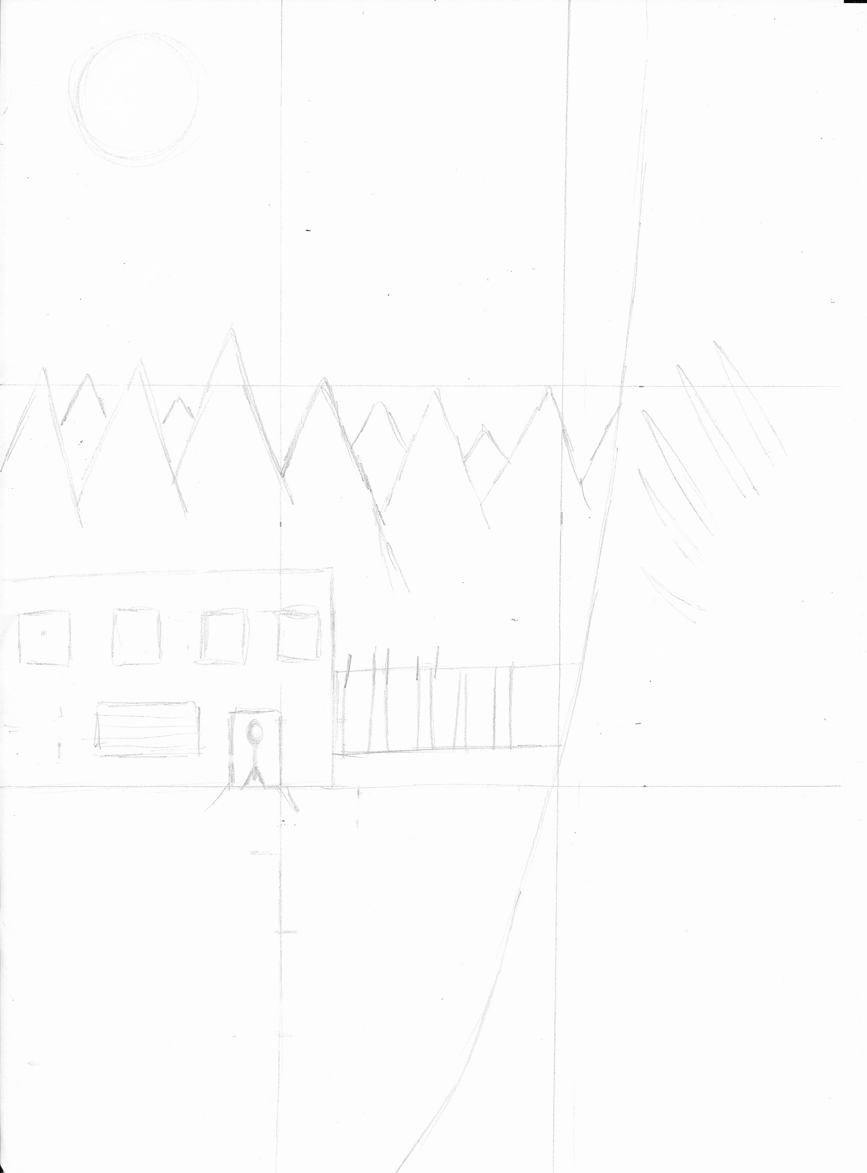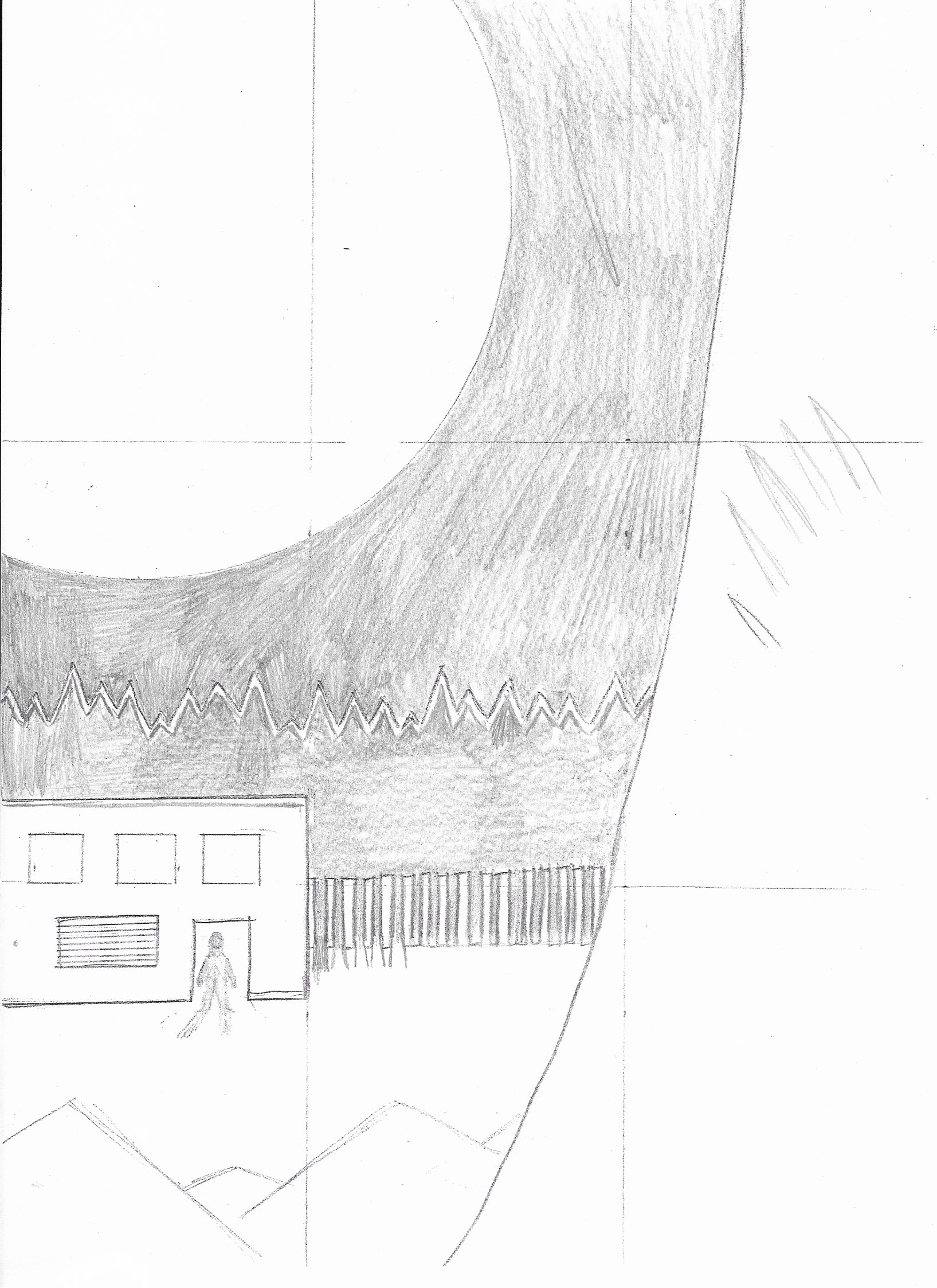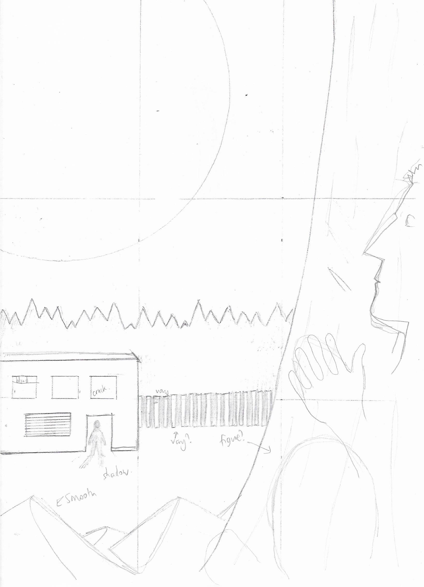 I decided on which sketch to use (based on the word ‘building’) and then divided an A4 sheet of paper into thirds so I could work out where to place focal points in the image. I tried various compositions.