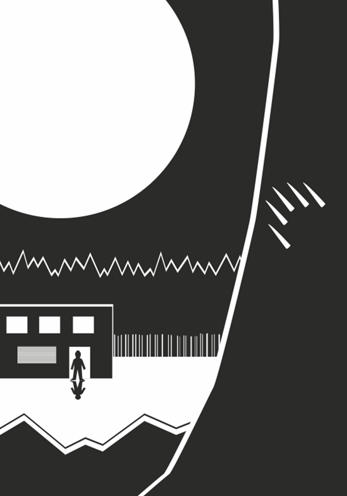 I think the use of black and white, as opposed to just the outline, adds depth and makes the illustration more dramatic and eye-catching. The focus of the outlined version seems to be the tree/hiding person (but this could be due to the increased line thickness, so probably there should be no overall focus in this version as everything is on the same ‘level’). The focus of the black and white version is the areas where there is a contrast of light and dark, the white standing out against the black. I hope the viewer’s eye would be drawn to the building due to its placement, greater detail and the strong contrast of white on black,.
