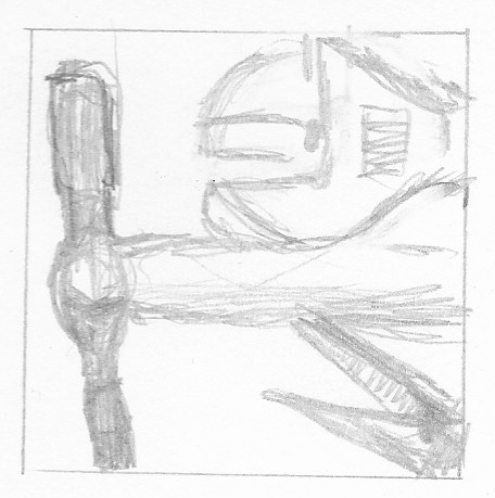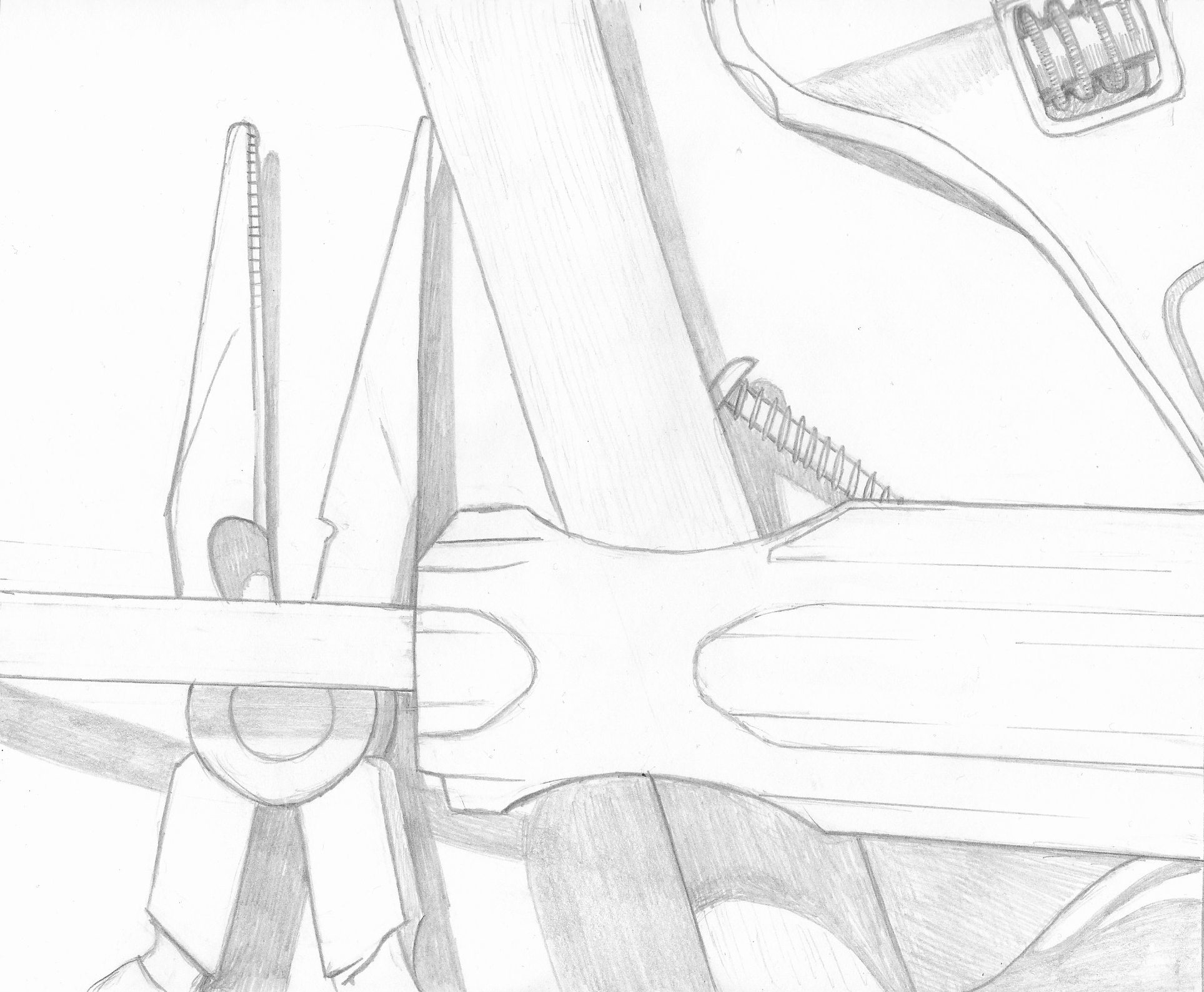 I thought the photographs were much more successful than the sketches. I found it very difficult trying to use a viewfinder whilst drawing the tools. I thought they worked well enough as thumbnails, but to use them as reference for a more detailed line drawing would have been challenging. I, therefore, selected one of the photos as the source for my line drawing.