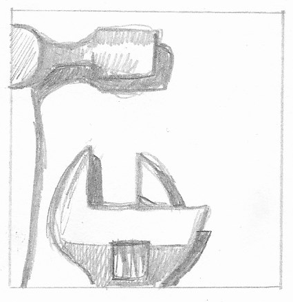 Do the same thing with drawing but work in a format that is different from your viewfinder, such as a square format, or long and thin, or an irregular rectangle. If it helps you can make a viewfinder using two ‘L’ shaped pieces of stiff card or paper in your chosen format. Repeat the exercise of exploring viewpoints but this time document your visual journey around the set in your sketchbook. Draw shapes to work with that are the same format as your viewfinder. You may find it helpful to draw around your viewfinder to create a set of thumbnail shapes.