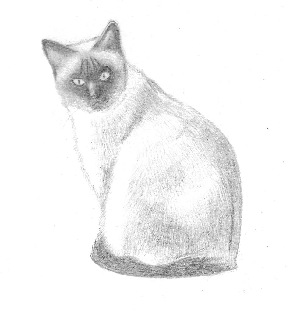 For research, I looked at Edouard Manet’s pencil drawings of cats. Although I did not attempt the same style, I found it fascinating how such lifelike images were created by applying ‘rough’ pencil strokes. I would assume they were done from life and therefore likely that haste would have been needed to capture the position before the cat (knowingly!) moved.