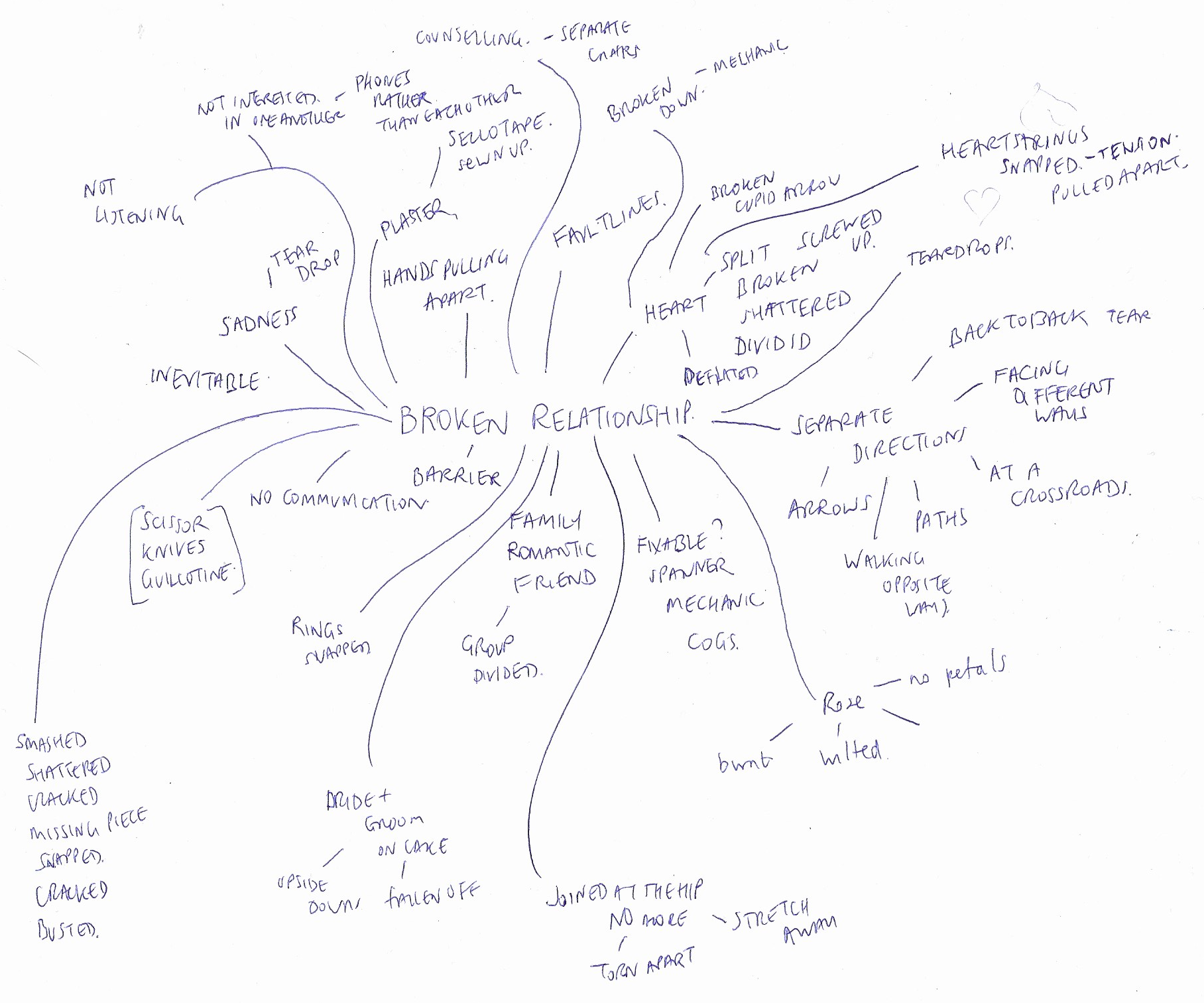 The phrase I chose for this exercise was ‘Broken Relationship’. I decided to mind-map the phrase to see what ideas this would lead to and I found this helpful.