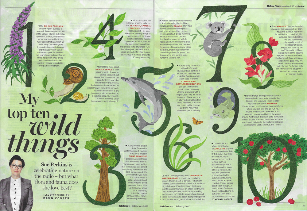 An illustration is required for a double page spread in an edition of the Radio Times, as part of an article advertising the Radio 4 programme ‘Nature Table’. The title of piece is “My Top Ten Wild Things” and is a numbered list of the presenter, Sue Perkins, favourite animals and plants. A description of each choice will be included, alongside a personal reason for each one.