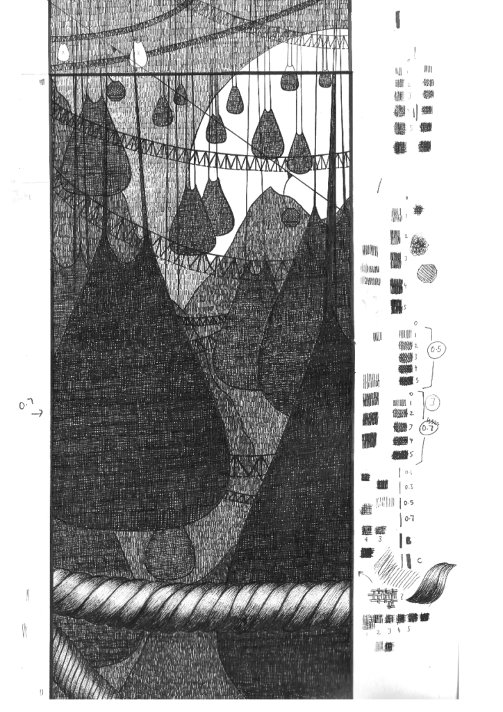 I used this as a template upon which I placed overlay paper and I then traced the outlines using fine liner pens. Although some of the lines were a bit wobbly at this stage, I preferred this version to the digital one and was glad I had made the decision to work in analogue.