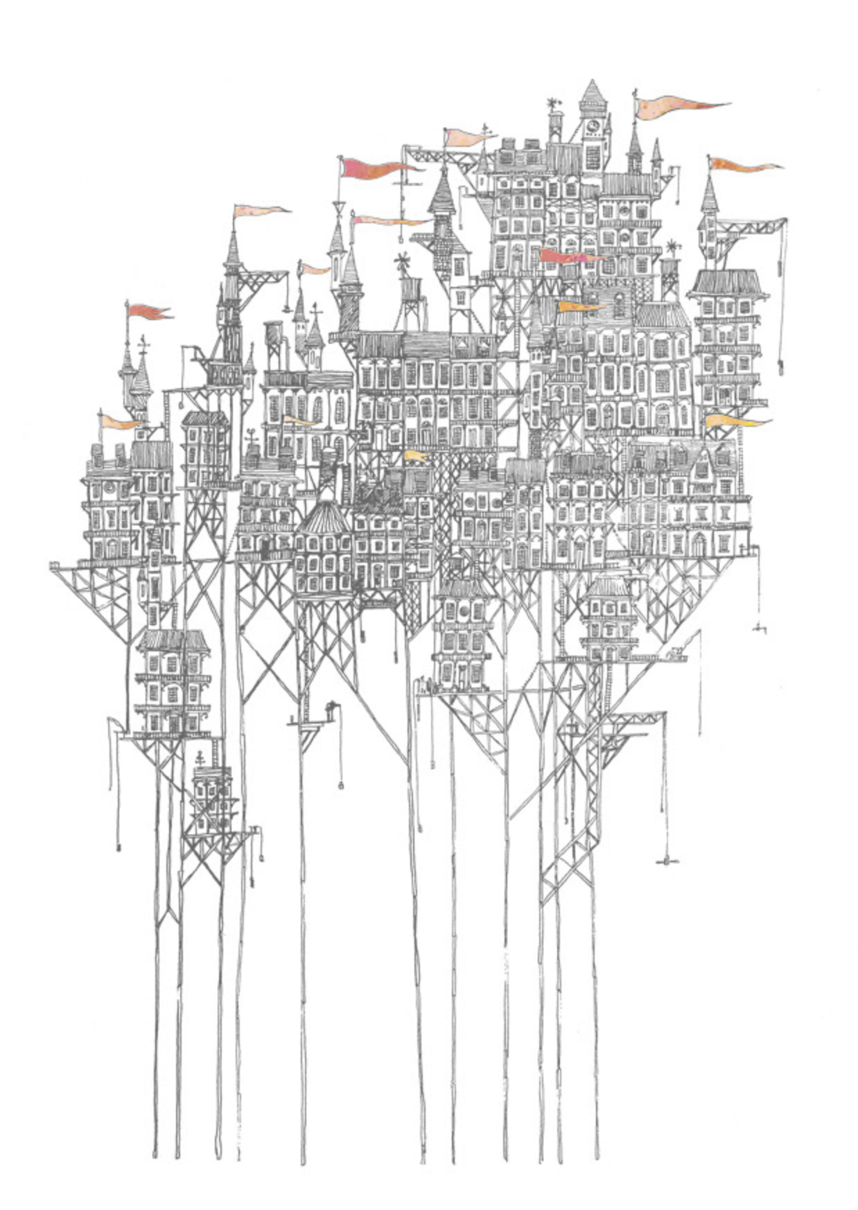 David Fleck – who has created intricately detailed, hand-drawn illustrations of several of the cities described in Calvino’s novel. Fleck’s illustrations, such as the one below, emphasise height rather than depth.