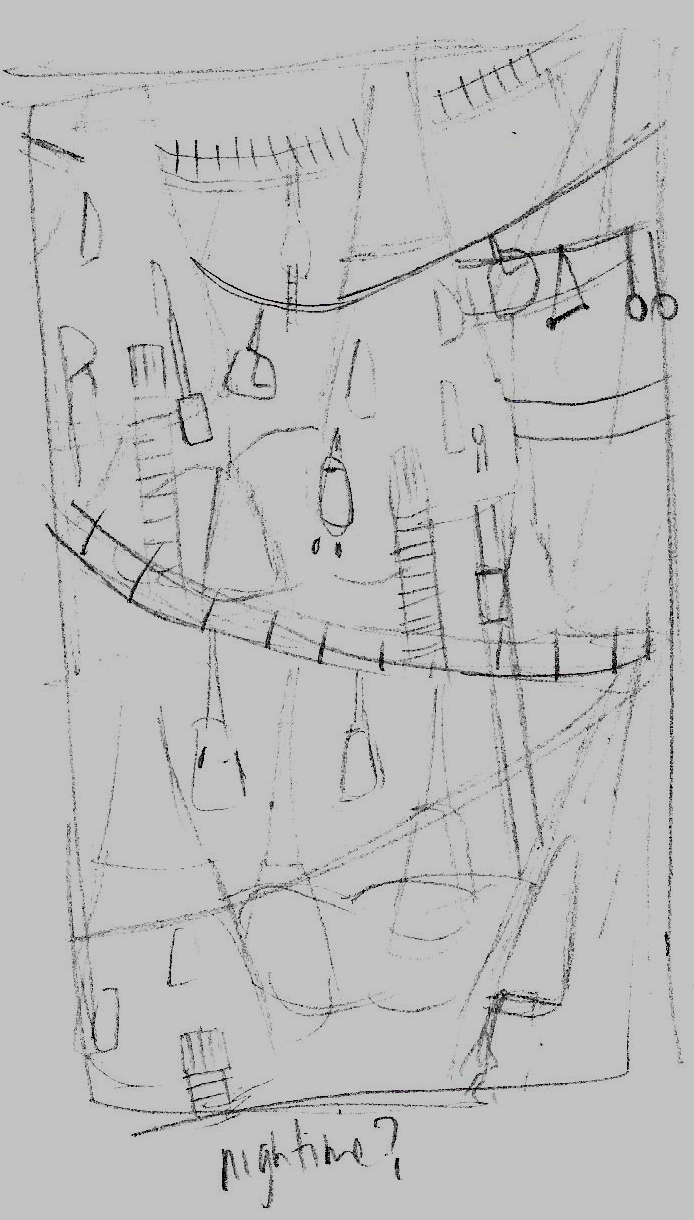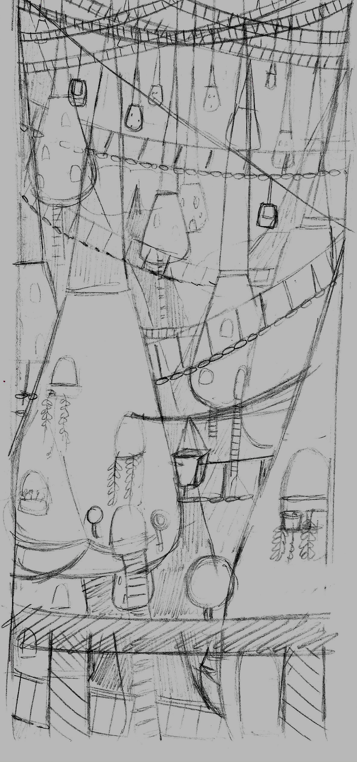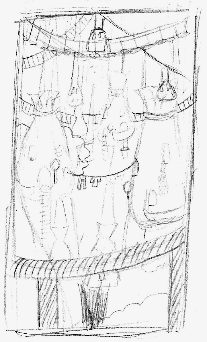 I began with a very rough sketch, as below, in which the ‘sack-houses’ hang down and the walkway bridges criss-cross between them.