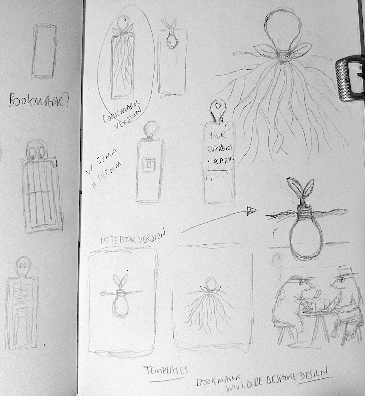 I drew out some neater pencil versions of my ideas, at the correct scale for a bookmark, and I felt the one below right was the most successful.