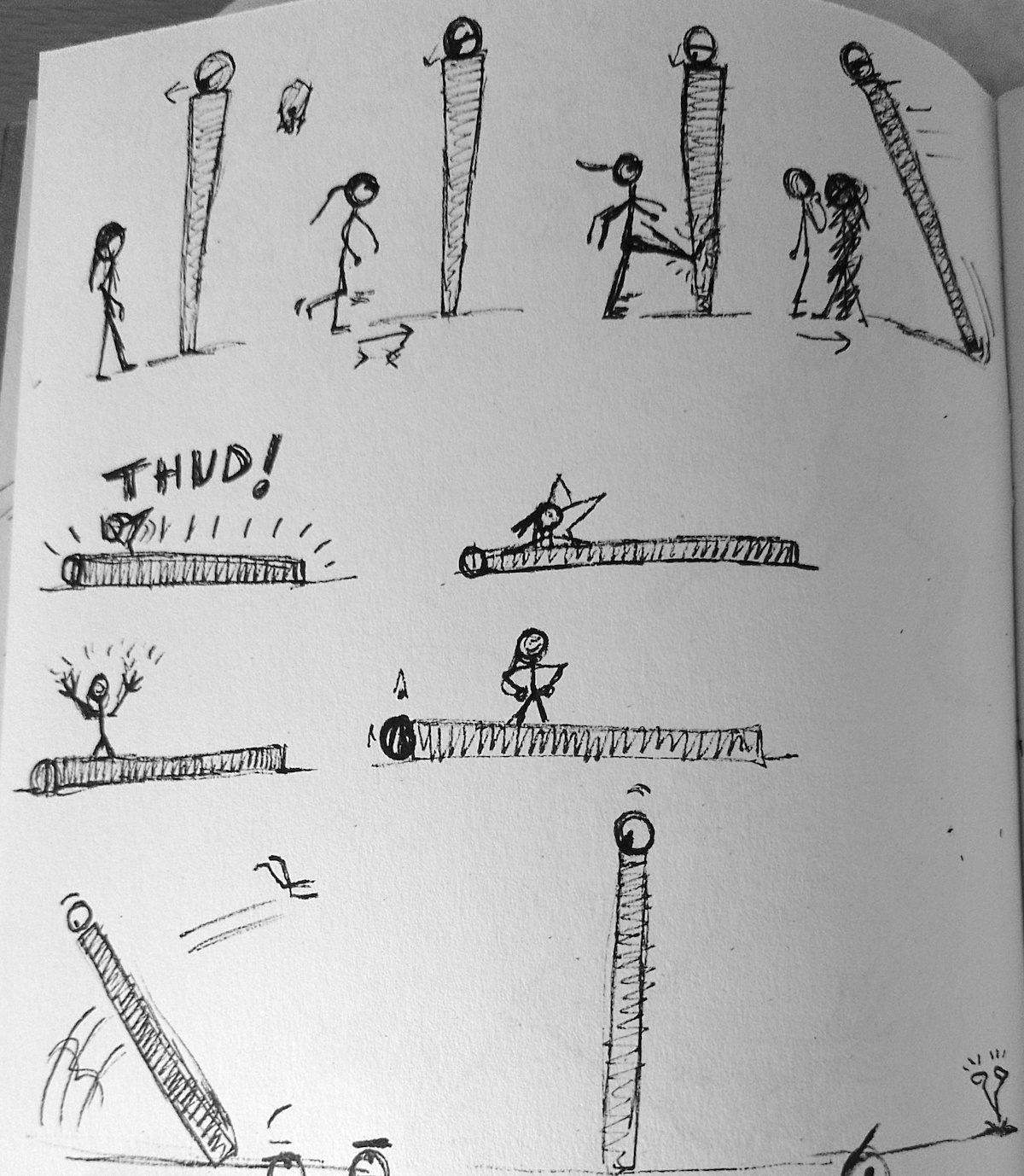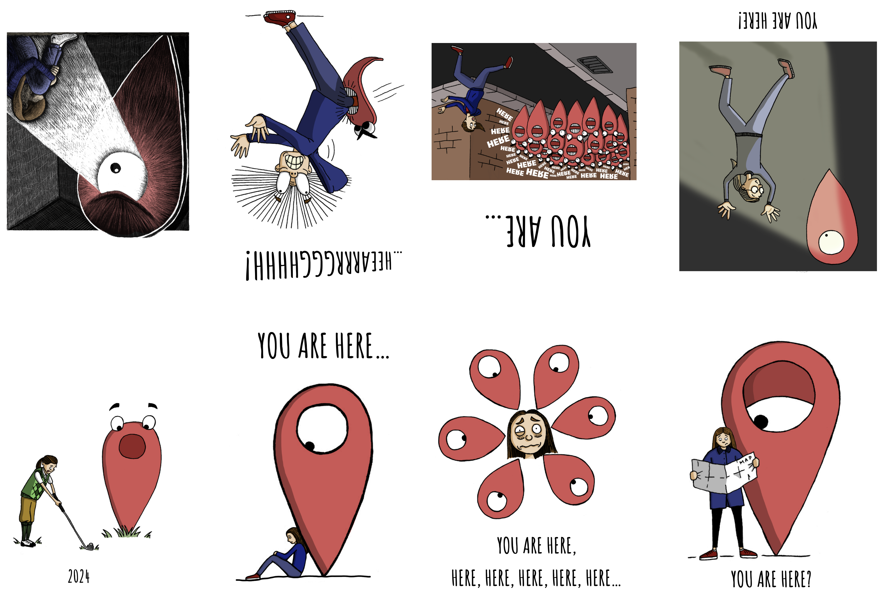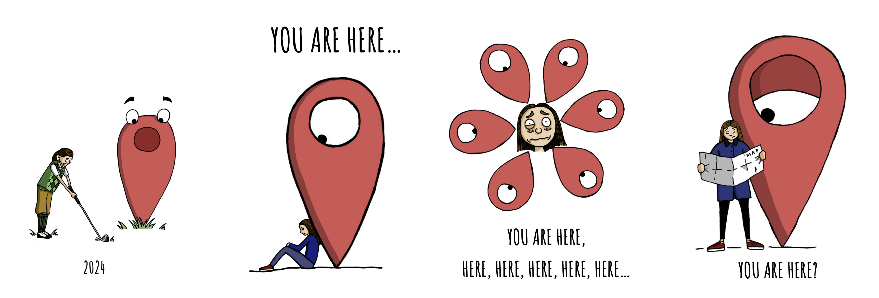In the drawings below, I had the idea of becoming frustrated with being told ‘you are here’, so the character kicks the marker. It falls down on top of her, but because of the ‘hole’ in the marker, she remains unscathed….