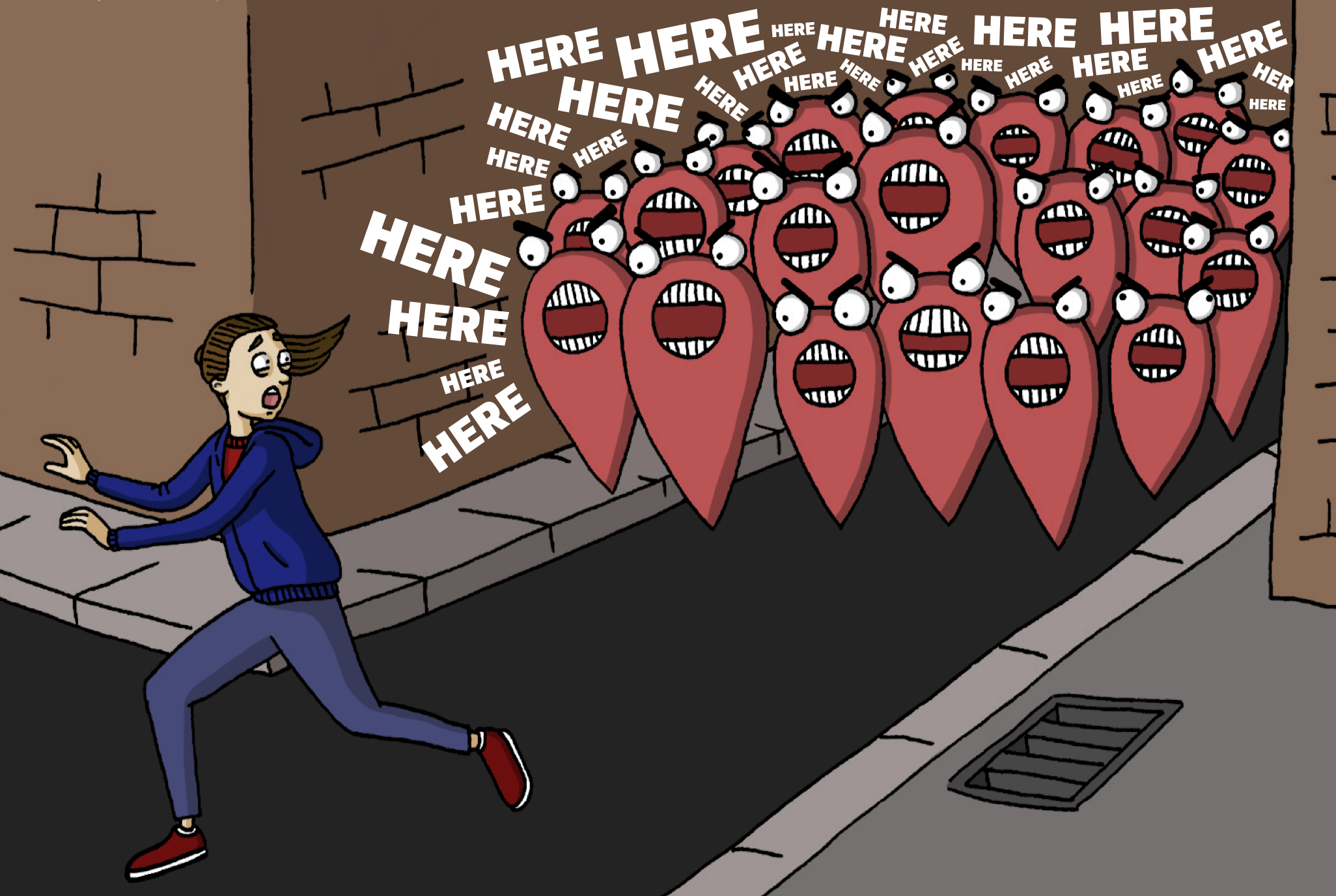 I quite liked the idea of the marker with teeth being quite vicious and looking to latch onto someone, like a leech. ‘You are here’ whether you like it or not – draining the life out of you.