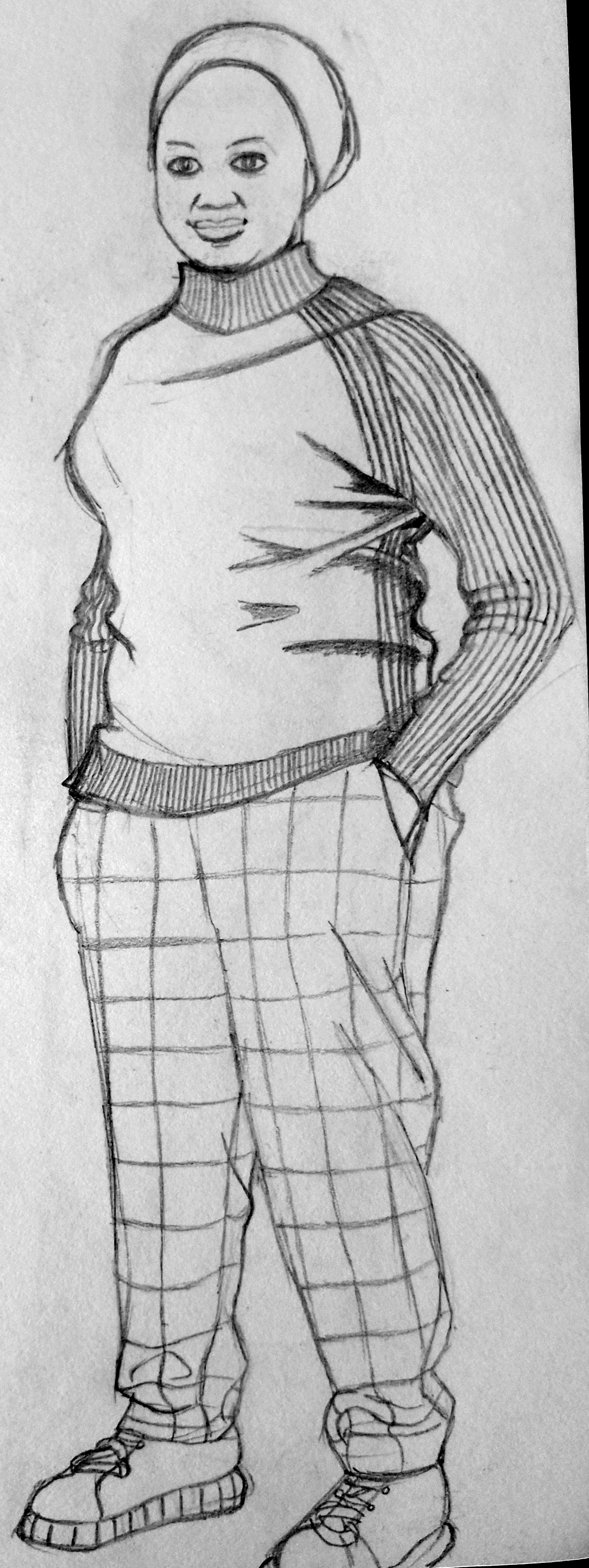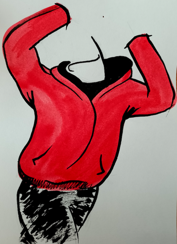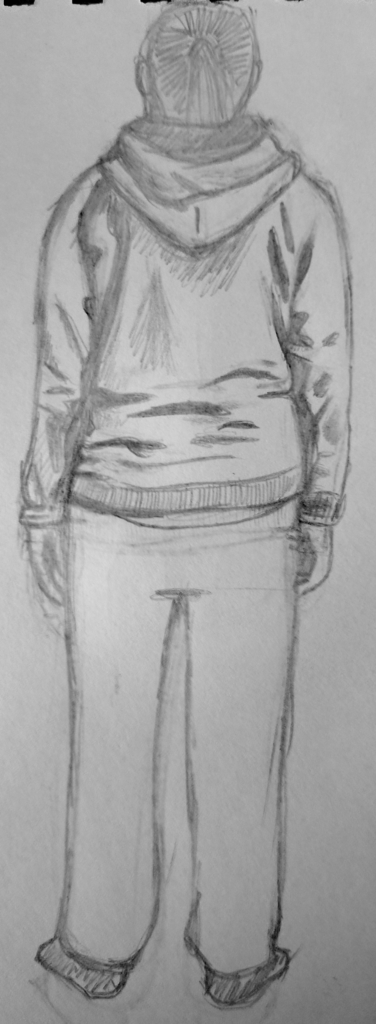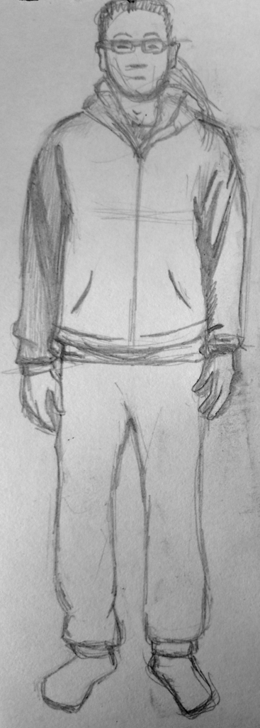 For the second part of this exercise, I decided to take the humorous route by using myself as a fashion model, wearing my standard outfit of a hoodie, tracksuit bottoms and socks. I began by drawing front, back and side views.