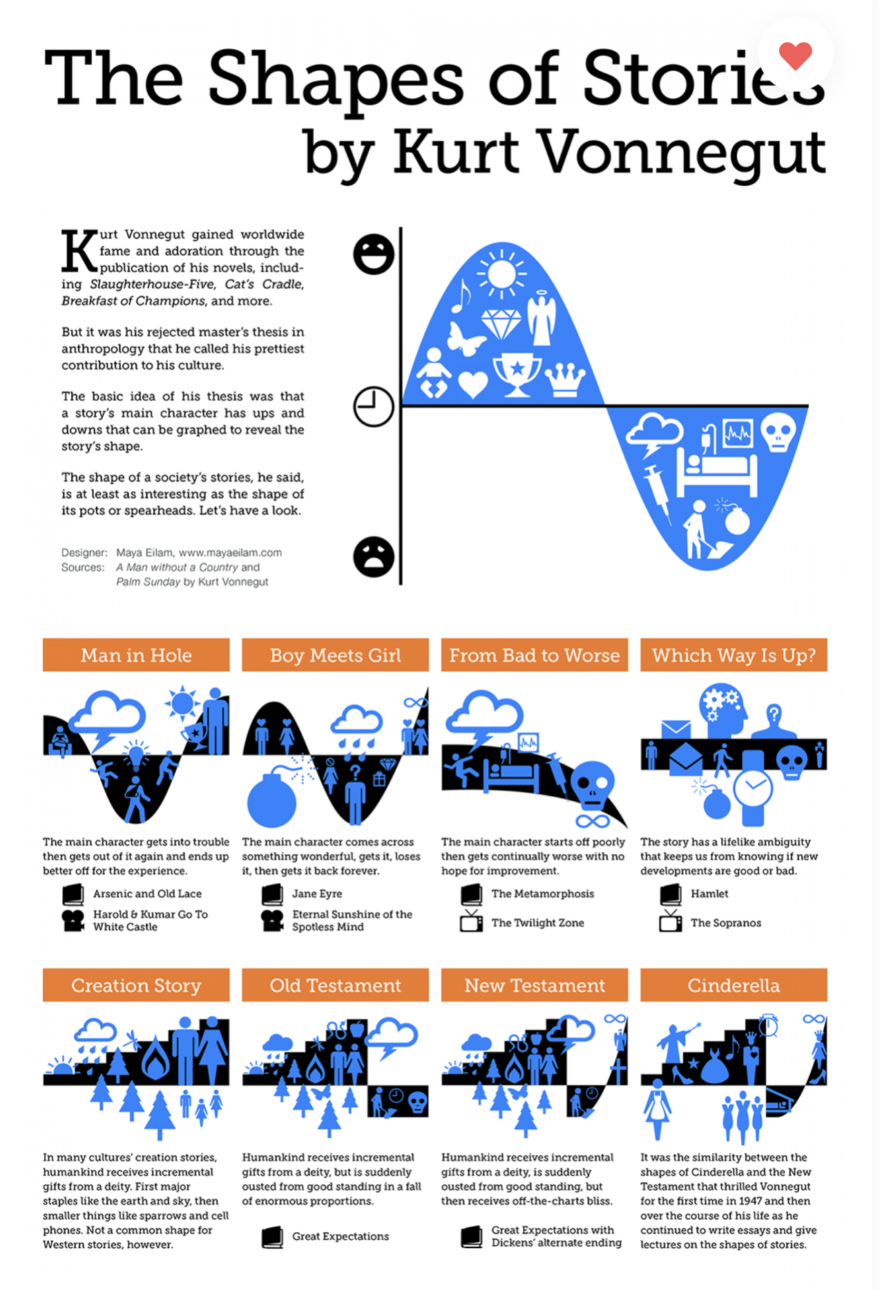 I thought the visual representation of narrative arcs and Vonnegut’s humorous explanations made it easier to comprehend. I also found an infographic of Vonnegut’s concept, which clearly depicts and thus explains each of the shapes that a story can form in the graph format.
