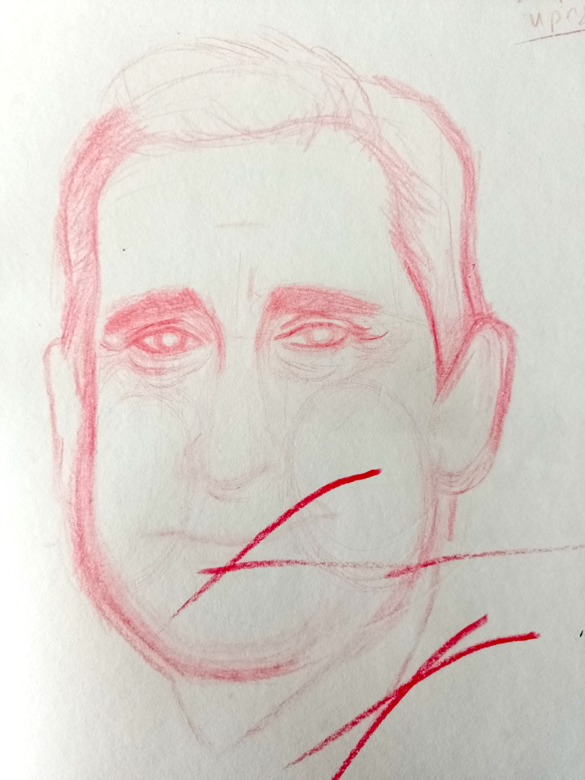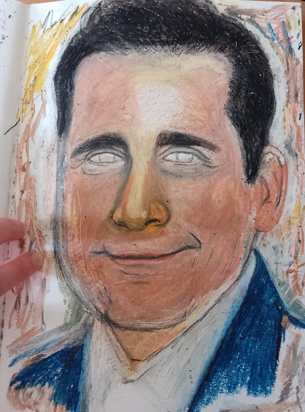 I started a fresh portrait of Carrell, this time I opted for oil pastels, which I rarely use. Initially, I found this way of working much less stressful as I could be quite free in applying the pastel. In fact, I was surprised just how much I enjoyed using this media. I liked how the colours blended (although my pastels are not very high quality) and were quite forgiving. I also discovered that it is possible to scrape of the pastel using a knife and work back into it.