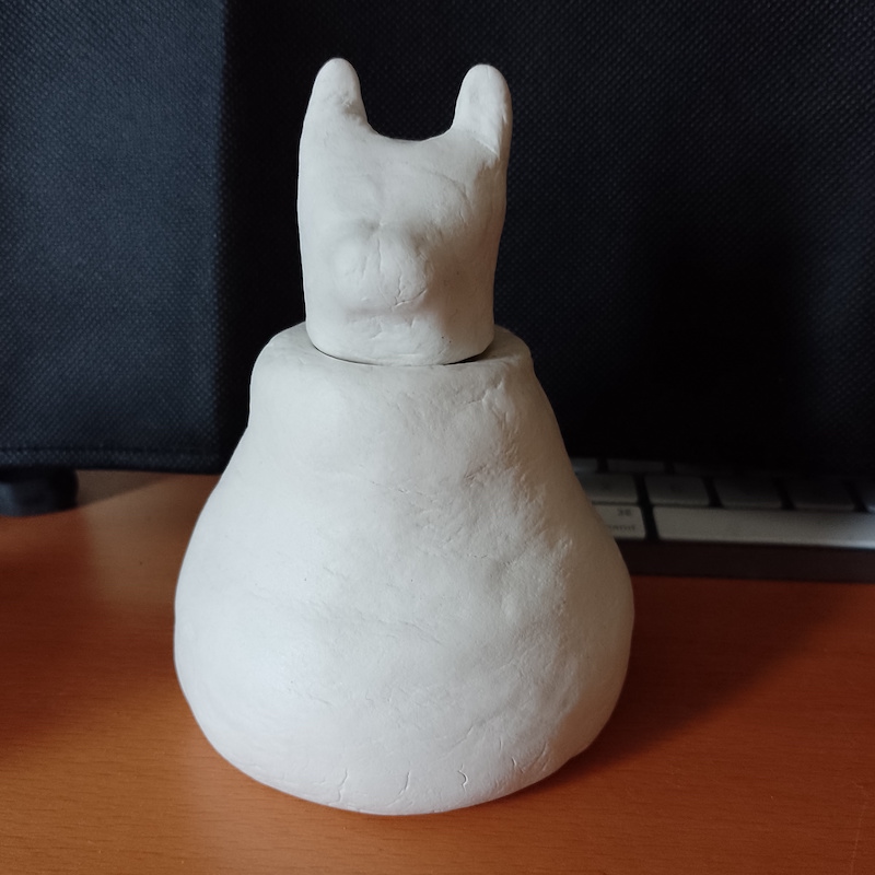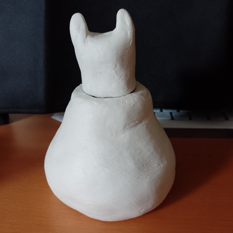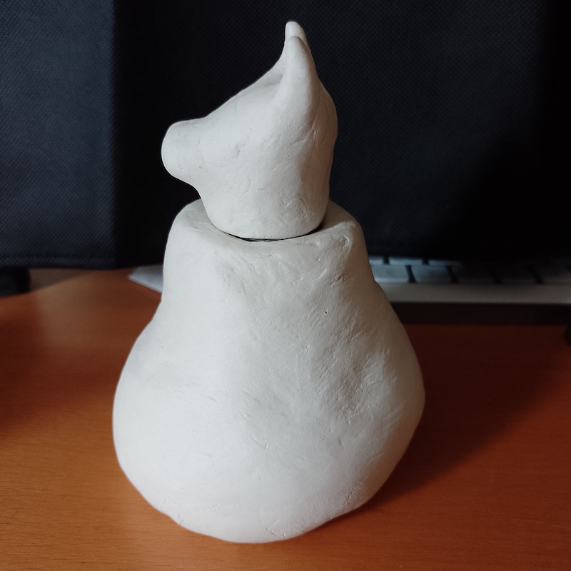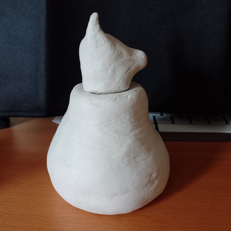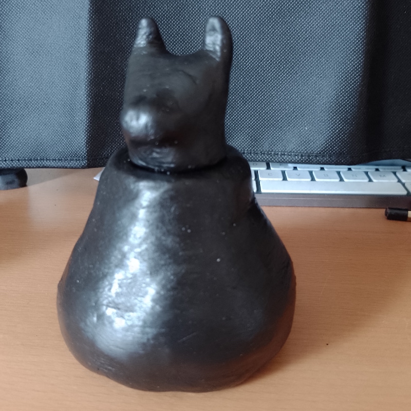 As I now had made the vase, I moved on to creating a cat-shaped head as a lid. This was quite fiddly and I did not get the nose/mouth area quite right (it looks more like a dog), but overall it was not too bad and, most importantly, it fitted in the hole at the top of the vase.