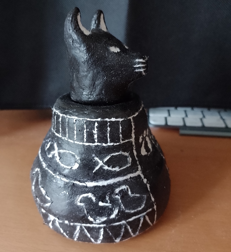 With all the above in mind, I sketched out a possible design of a vase/jar based on my cat and her likes. For some reason, I had lost the connection to the sleek shape of the canopic jars, which I liked, and instead my sketch looked more like an Easter egg.