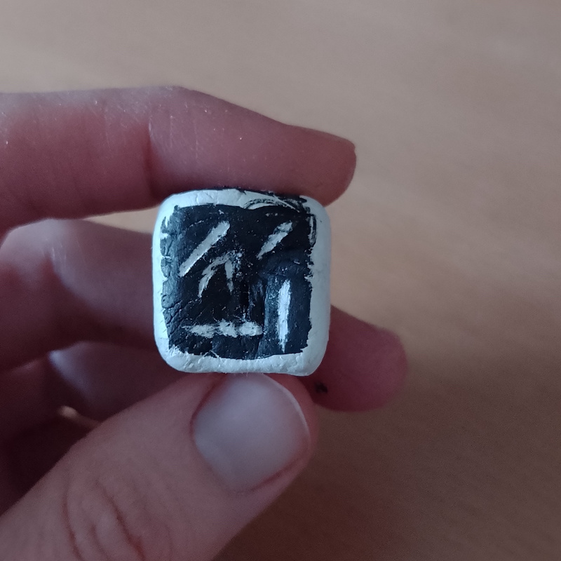 Reflecting on the mishap of using acrylic paint, I realised that instead I should have tried using black ink, which is what is the surface on scratchboard is coated with. I tested this with a tiny square of clay and it worked much better. The surface of the clay was not particularly smooth in this test, but there was no gumminess or clinging involved!