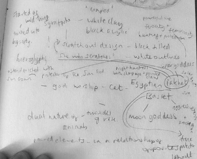 I spent some time looking in particular at two Egyptian goddesses – Bastet and Pakhet, both of whom were goddesses of war. I particularly liked some of the key attributes of the latter, including a ‘night huntress with a sharp eye and and pointed claw’ and ‘she who scratches’ but I also liked the dual, contrasting sides of the goddesses – such as hunting and protection or ferocity and feminism.