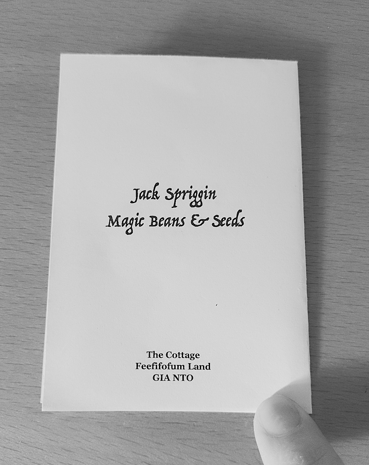 Note II: Jack Spriggins refers to the title character in Jack and the Giant Beanstalk, which I thought would tie in nicely with the idea of a magical seed. I was considering using this name as the that of the company that sells packets of the ‘Epiphany Flower’ seed.