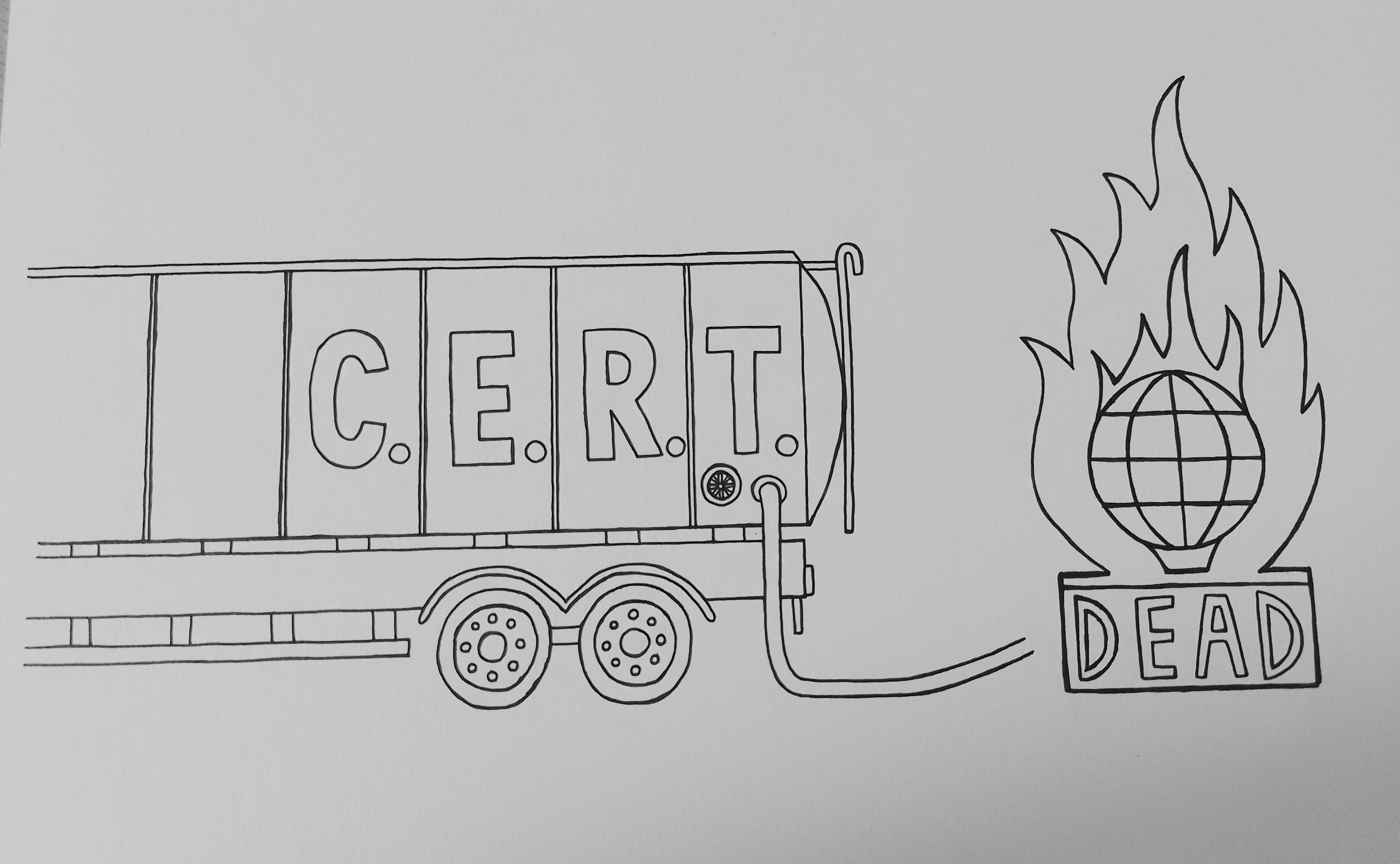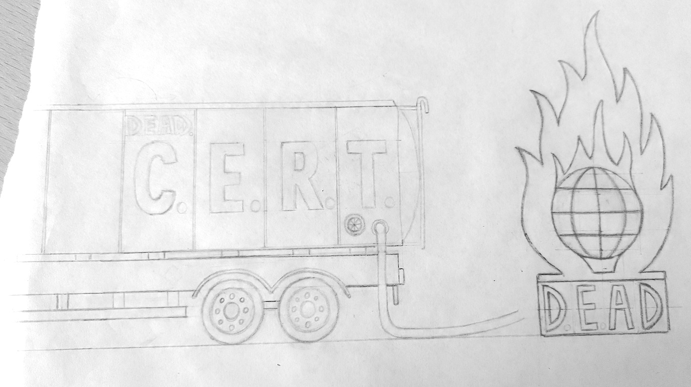 Whilst I was doing this, rather than using a real world oil company logo (and being sued?), I came up with the idea of a logo/title that that summed up my opinion of the world leaders’ action on climate change. There would be a government department called The Department of Excuses and Delusions and this faction would be one of the ‘Climate Emergency Response Team‘s. I then came up with logo, which I was quite pleased with, showing a generic globe icon surrounded by a flame. The acronym DEAD seemed appropriate, and, alongside the other acronym CERT, which can be used in speech to describe something that will inevitably happen, produces the words ‘dead cert’ – implying that it is dead certain that the end of the world is nigh if left in the hands of these nitwits.