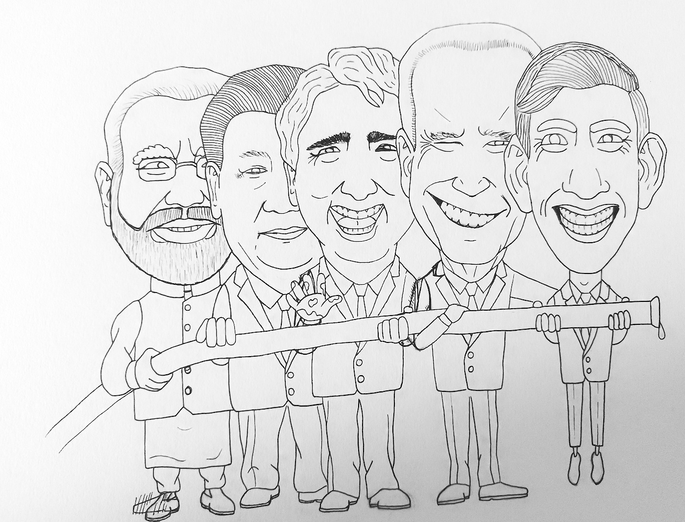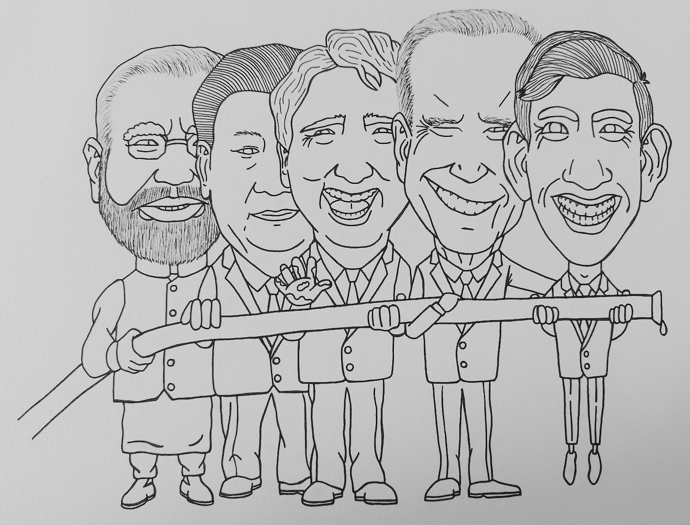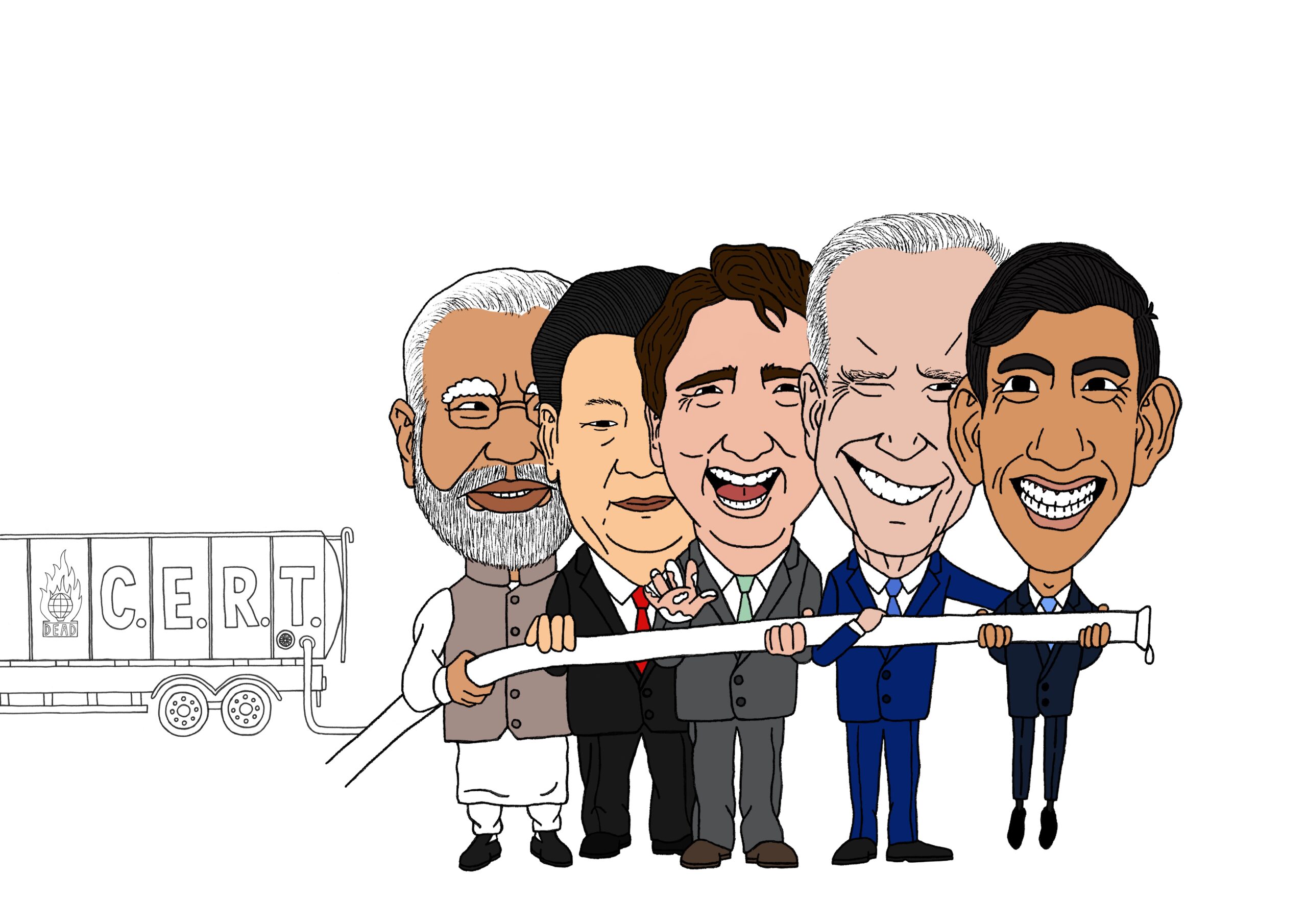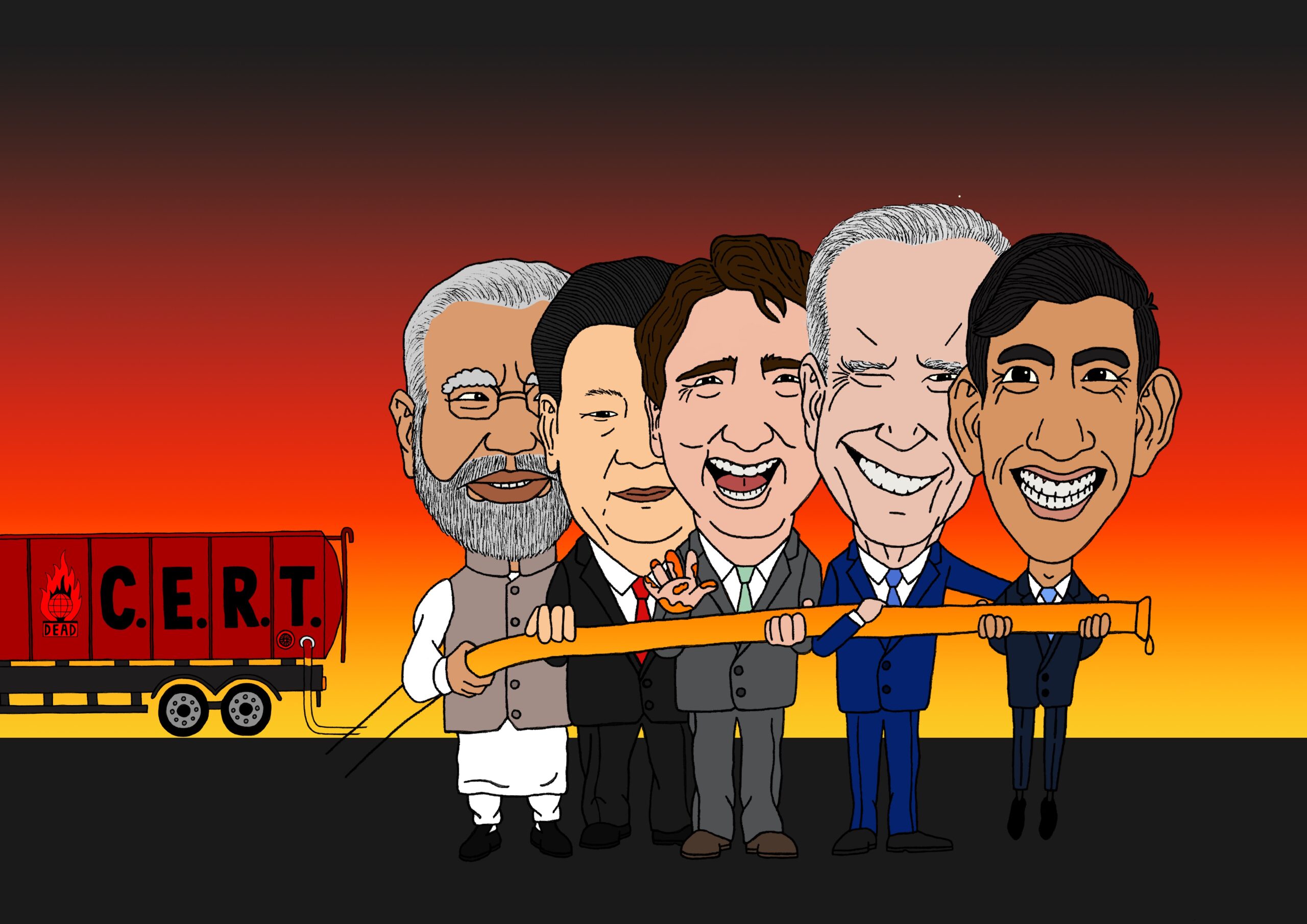 In the end, I picked five: Rishi Sunak (UK), Joe Biden (US), Justin Trudeau (Canada), Xi Jinping (China), and Narendra Modi (India). Rather than have them ‘putting out’ an actual burning planet Earth, which was not very logical, I decided to show them attending an implied wildfire.