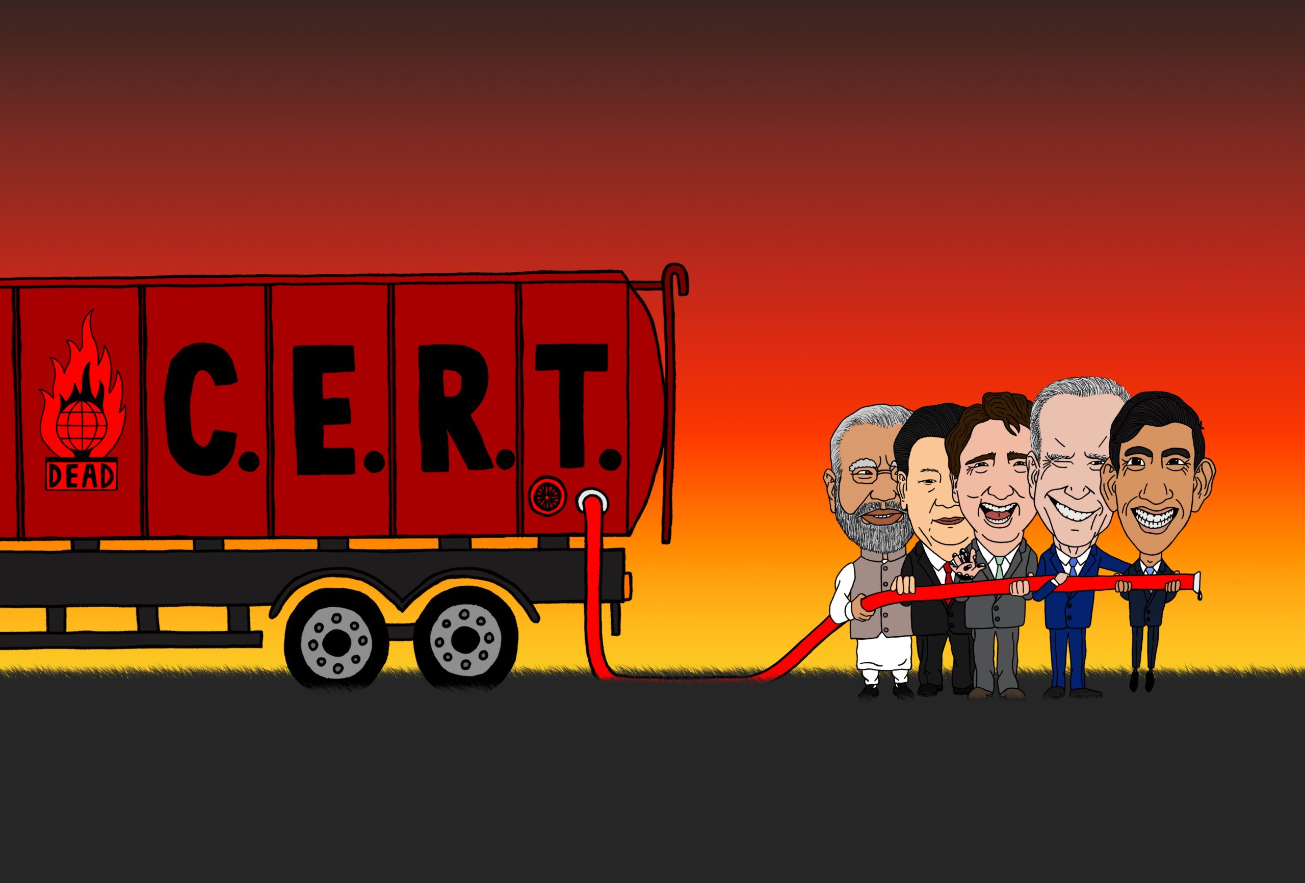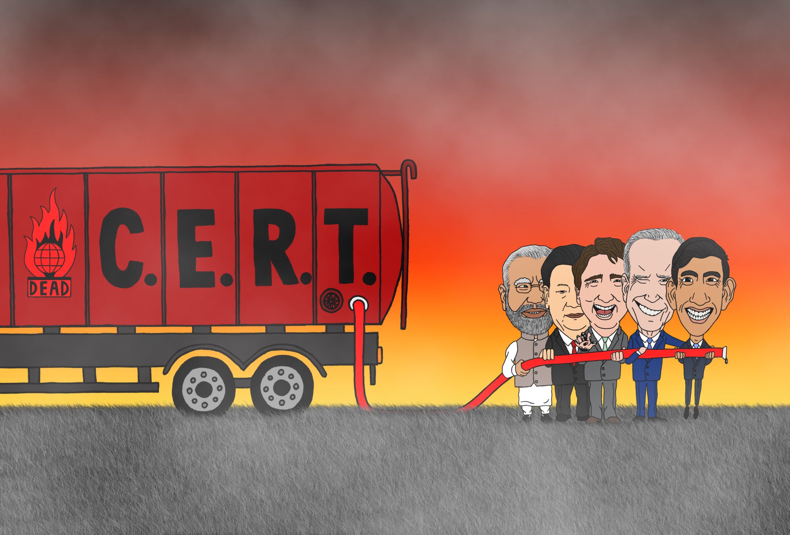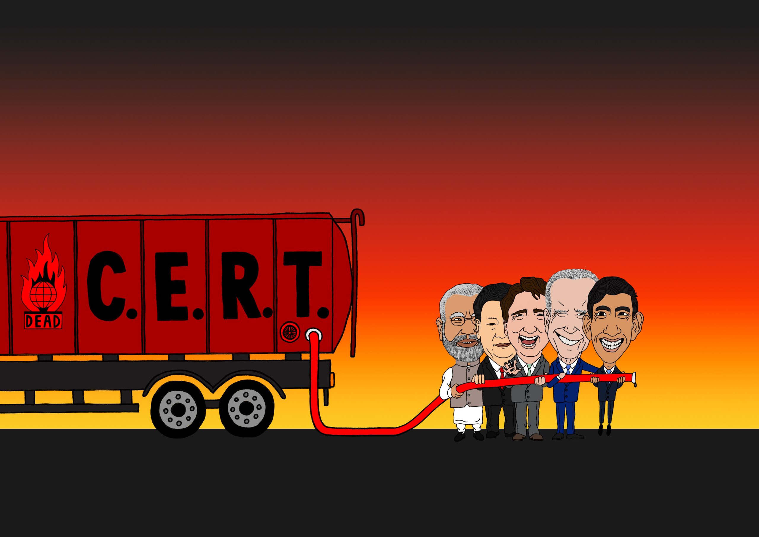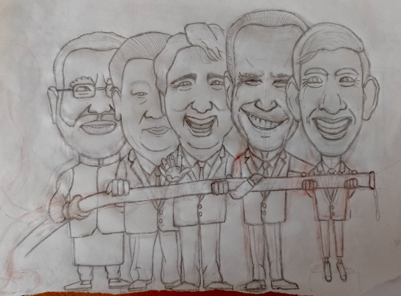 In the end, I picked five: Rishi Sunak (UK), Joe Biden (US), Justin Trudeau (Canada), Xi Jinping (China), and Narendra Modi (India). Rather than have them ‘putting out’ an actual burning planet Earth, which was not very logical, I decided to show them attending an implied wildfire.