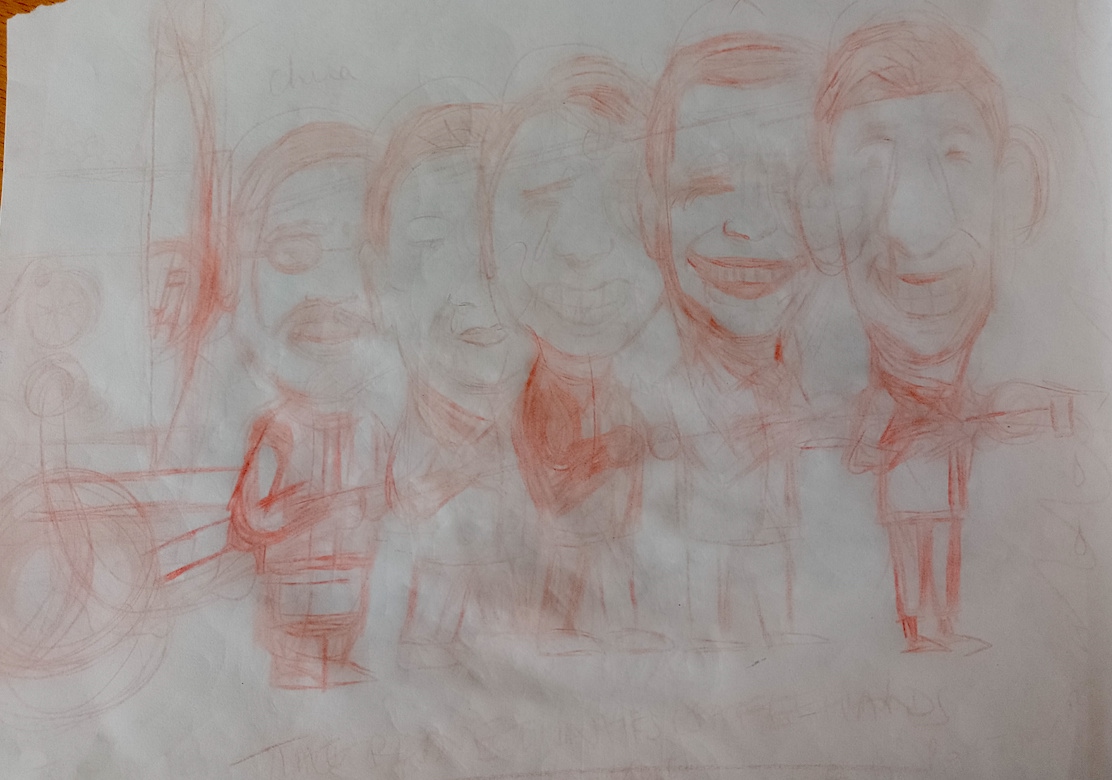 I felt quite happy with my progress at this stage, but now came the challenging part where I had to try to draw recognisable versions of the five politicians! I lost track of how long I spent on producing the pencil version, below. Overall, I was quite happy with it, but it was incredibly difficult to make them at least vaguely look like the real-life counterparts. I found Biden particularly tricky, especially his eyes and mouth. As a side observation, I was pleased with the folds/creases in the trousers as I really had tried make these quite realistic. Hopefully, it was worth the effort.