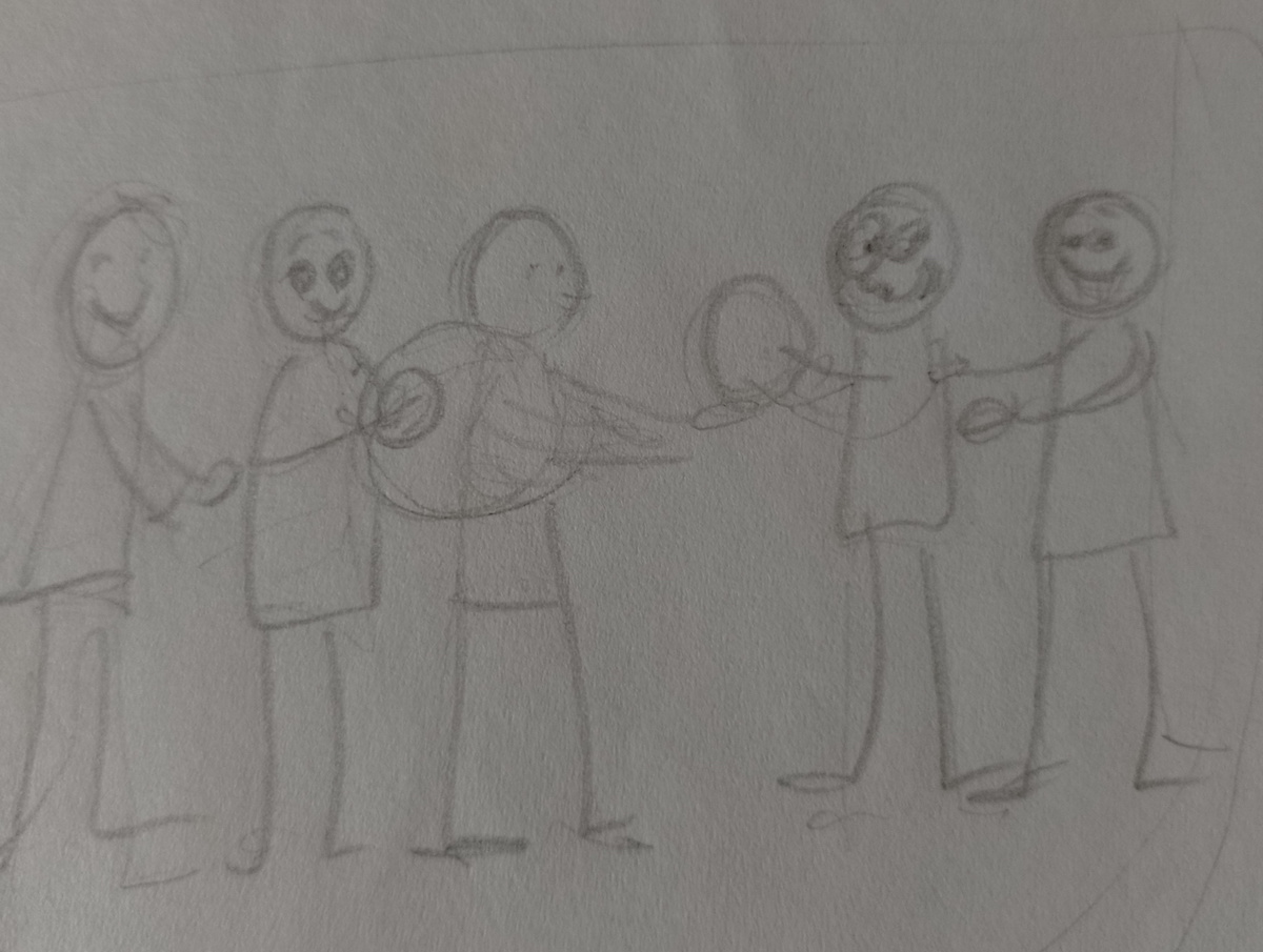 The sketch below shows politicians passing the ‘hot potato’ planet along the line.