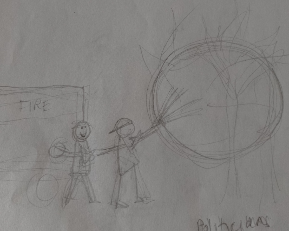 I expanded on this idea, below, and thought that perhaps the fire engine could be an oil tanker in disguise, with a politician pasting the ‘fire’ sign onto the side of it.