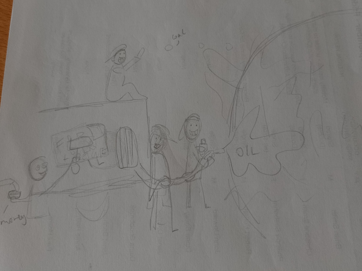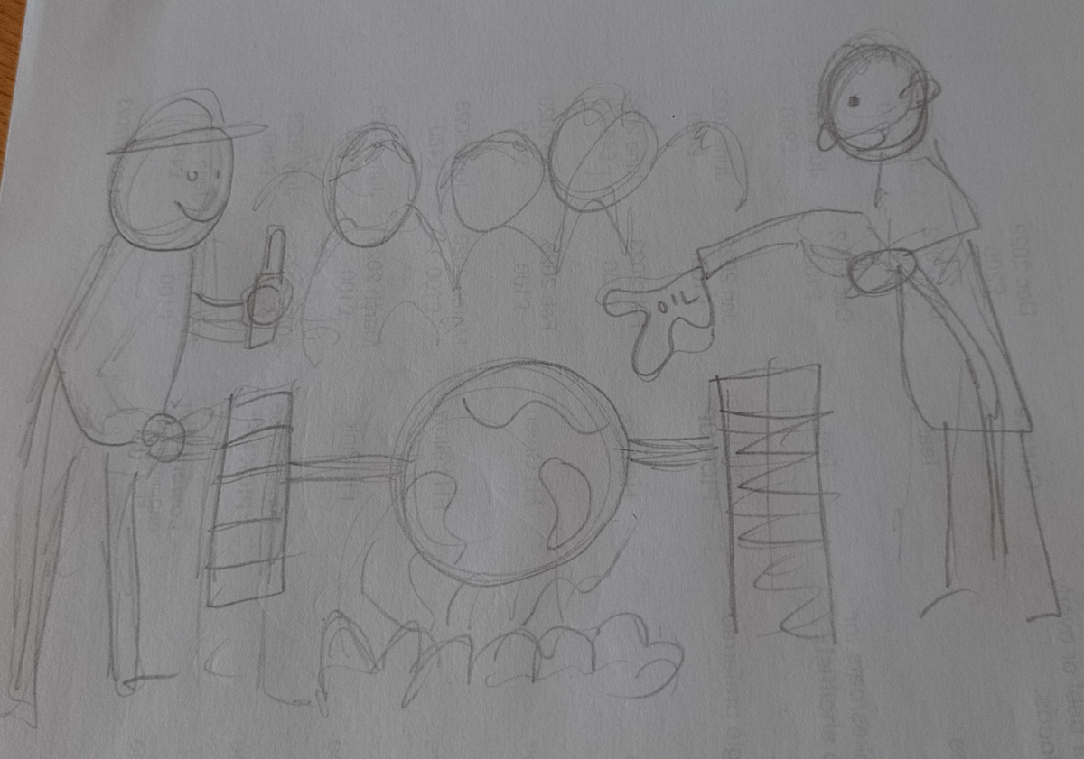 The drawing below is based on the idea of politicians going into ‘election mode’, with Sunak being connected to an oil pipe and money being put in his back pocket (relating to lobbying/donors) and Starmer standing next to him with a confused expression, not sure what to do with the pipe he is holding.