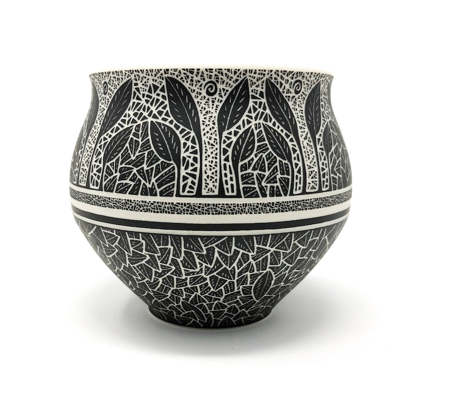 An example of a contemporary artist using this technique is Becky Lloyd. Her hand-thrown pottery is covered in black slip and Lloyd then uses a sharp knife to scratch away this top layer to reveal the white underneath.