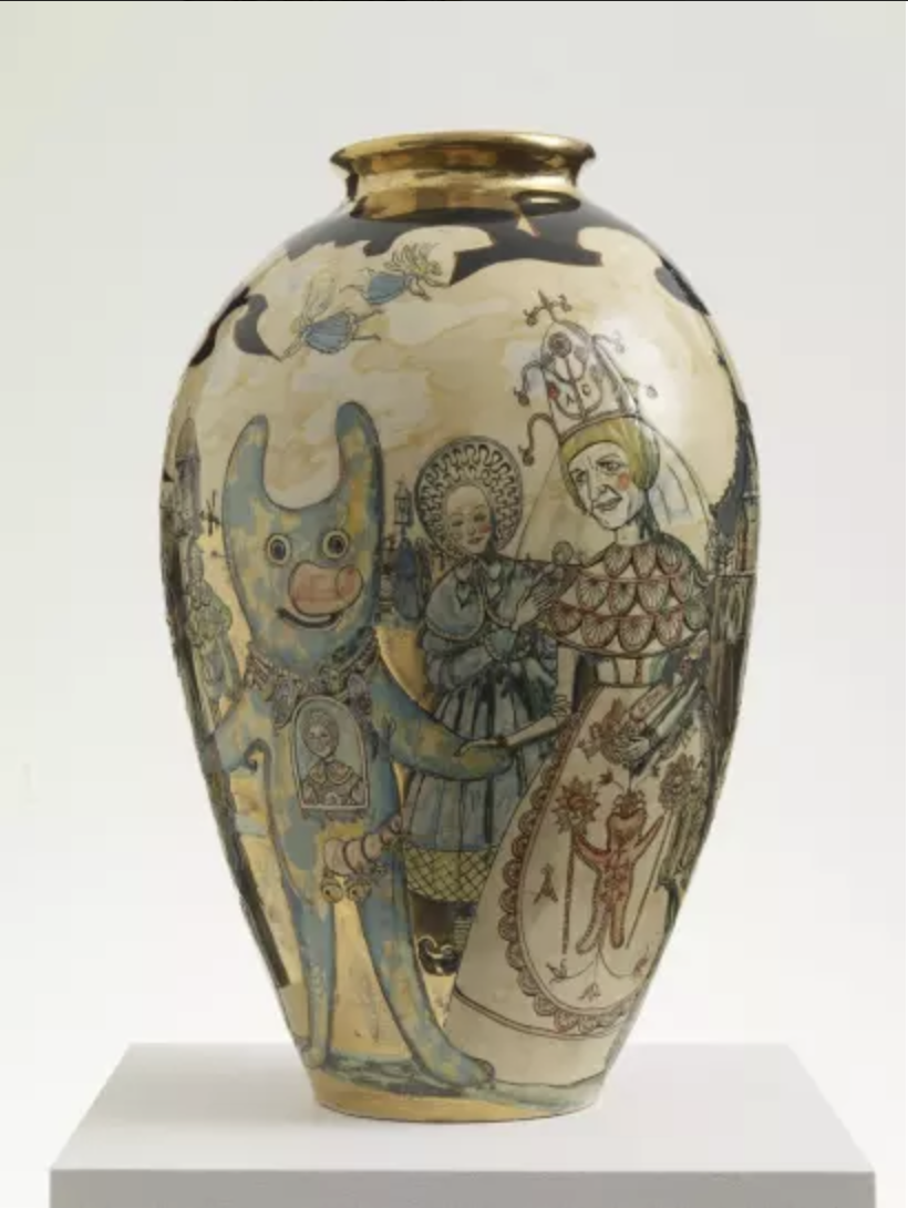 An important point to make about Perry’s work is how he uses traditional methods, such as ceramics, to produce what, from a distance appear to be well-made, attractive vases and so on. It is not until the viewer really gets in close and actually looks at the illustrations that adorn the items that it becomes clear the subject matter is often hard-hitting, often based on subjects such as sexuality/gender, deprivation/inequality, childhood, abuse, politics and the like.