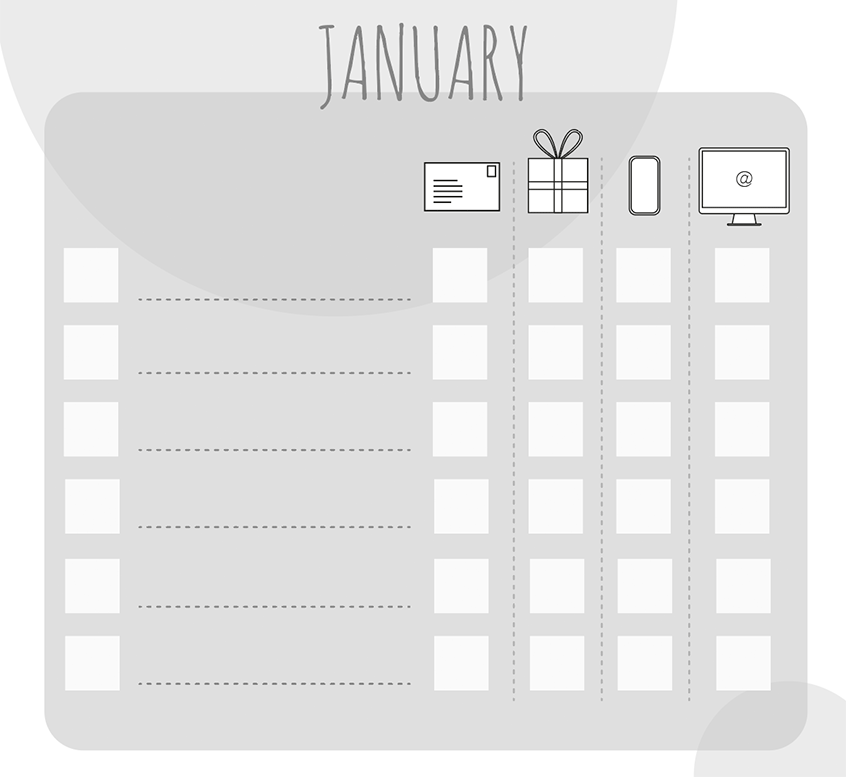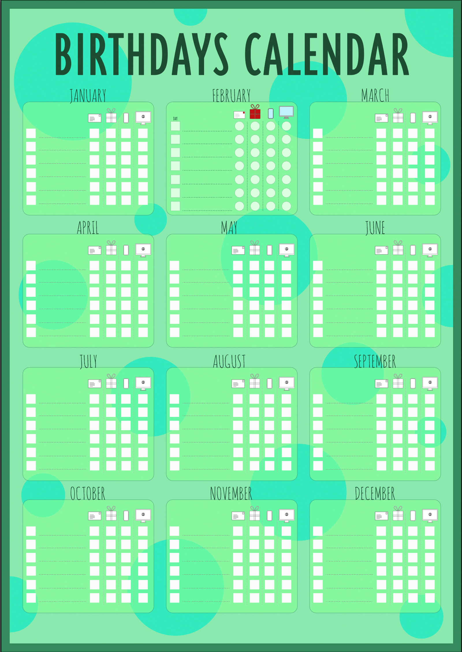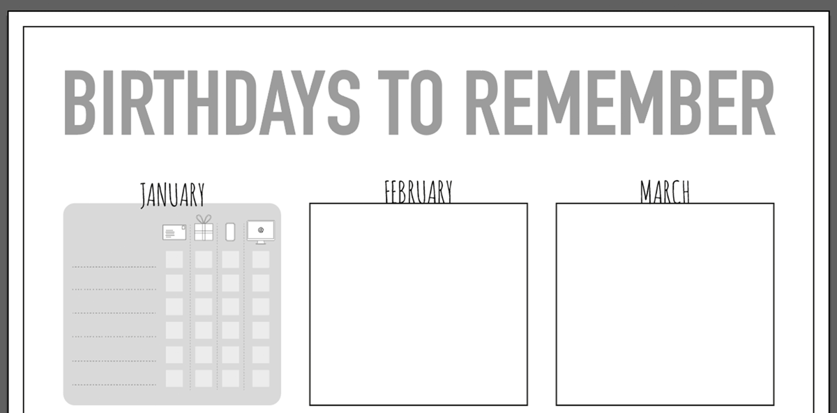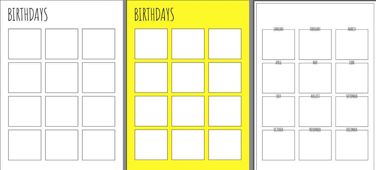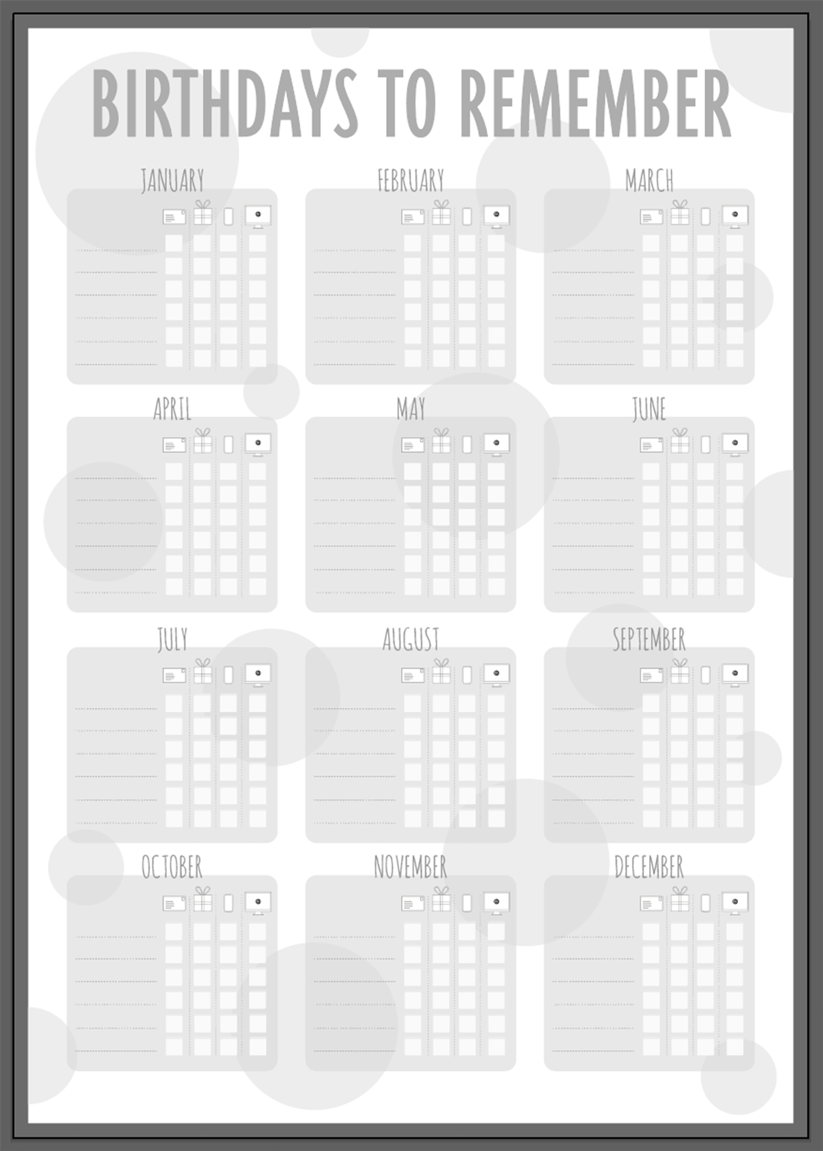 Start by collecting all the birthdays of your friends and family. You’ll need their name and birth date, to decide whether or not you buy them presents or just send a card, text message or email. Design a page to include all of this, ordering it in a way that best suits you and including as much additional information as required.