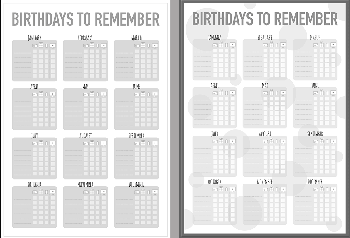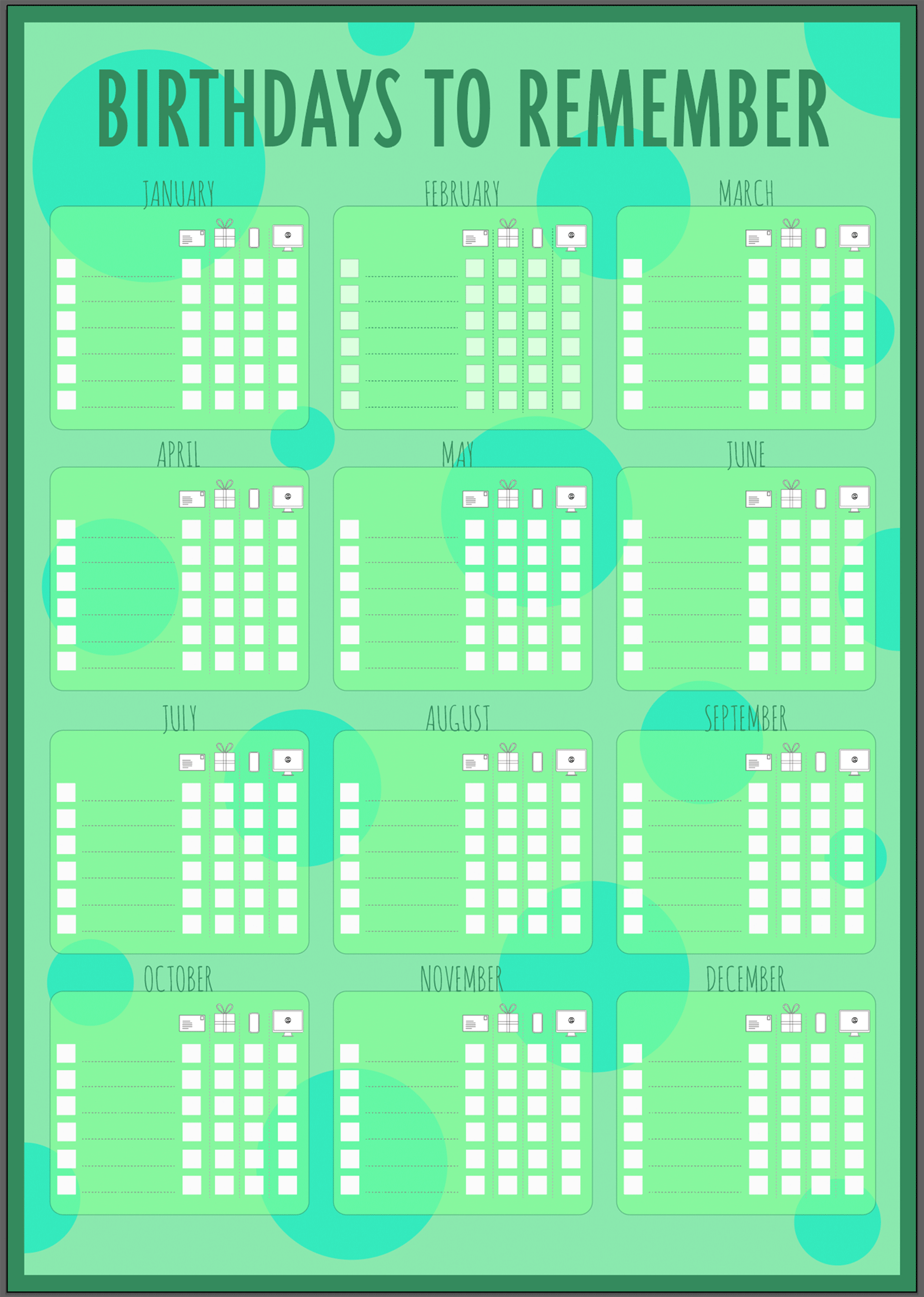 Create a poster of a birthday calendar that can be pinned to a noticeboard or wall to remind you of dates and, as it will be there a long time, it needs to look good.
