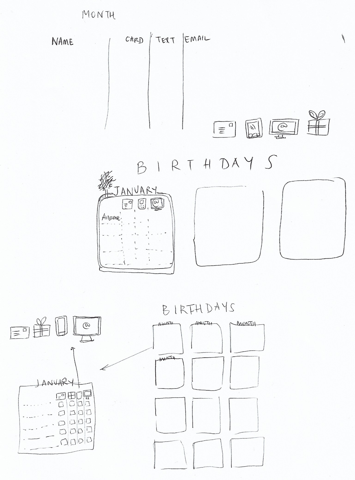 I considered the information that I would want on the birthday calendar. I decided that it would just include the person’s name and whether they would receive a card, gift, text or email. I made a very rough sketch of my idea for the layout. I needed to make sure I incorporated enough white space within the design despite there being a lot of different elements on the page.