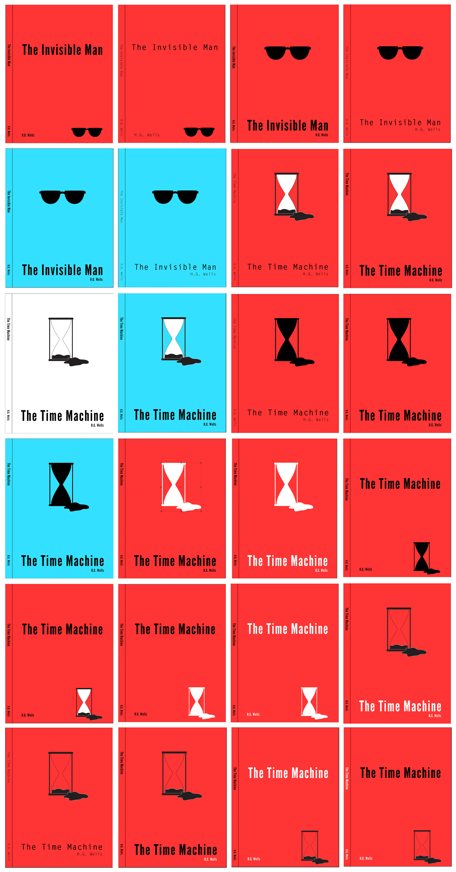 The final experiment was to create minimalistic vector-based designs. I wanted these to be more contemporary in appearance – similar to the cut-out style of some of the Pinterest examples. I created very simplistic vector illustrations of a sand timer and sunglasses in Illustrator for The Time Machine and The Invisible Man respectively. I then tried out various layouts for the cover. I experimented with both Letter Gothic and League Gothic fonts, but I felt that the latter looked better as it appeared stronger on the page, which was what I was trying to achieve with these designs. I think it was well suited to the bold style of the illustrations. At the time I was unable to think of an object that could represent The War of the Worlds, which is why I only created examples for the other two.