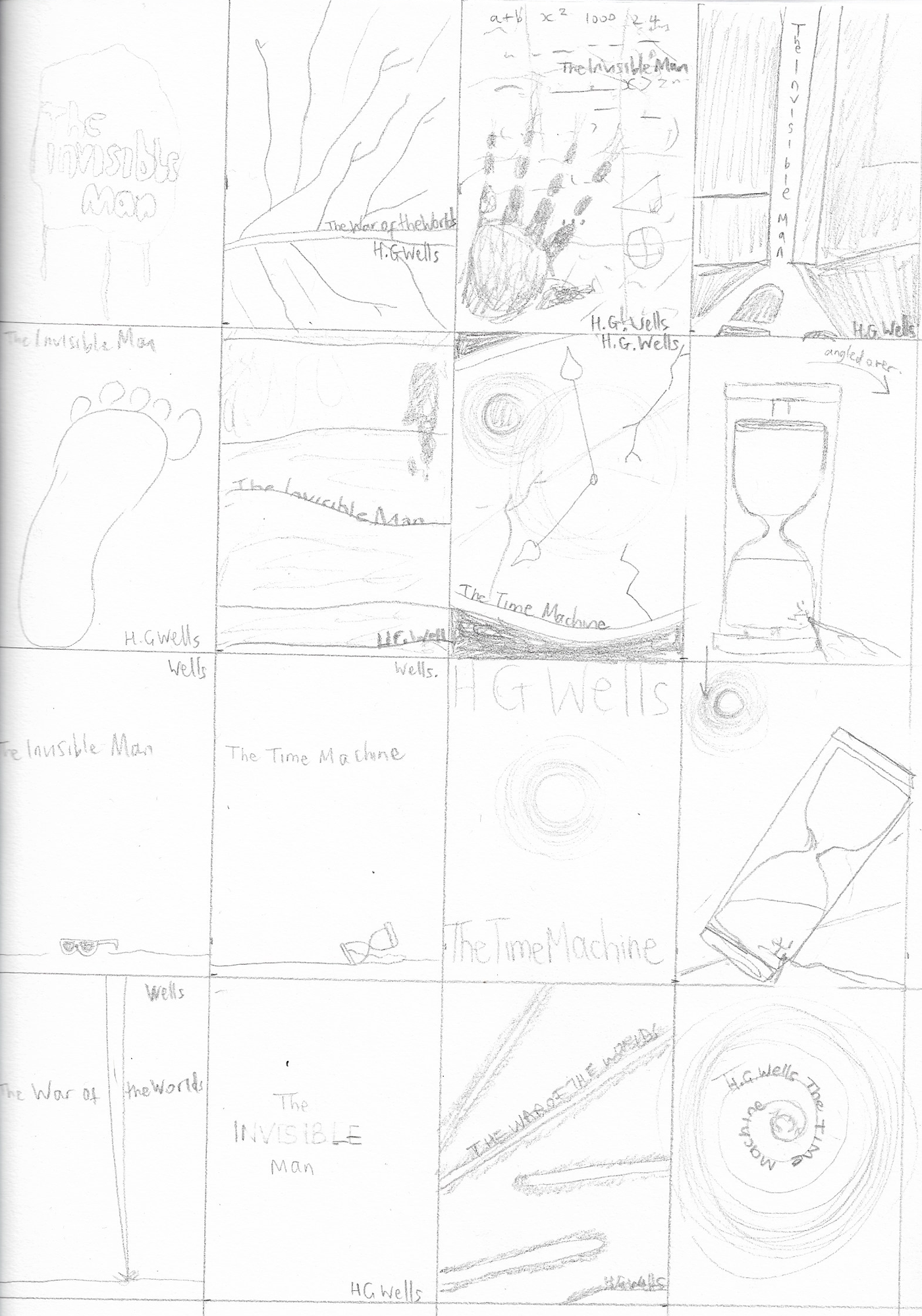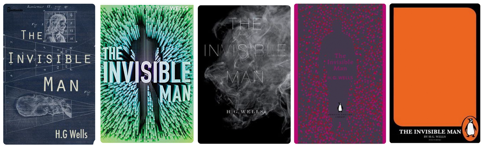 ROW 4 (L-R): fighting machine tripod leg; word ‘invisible’ rubbed out; laser beams across cover; title being ‘time-warped’.