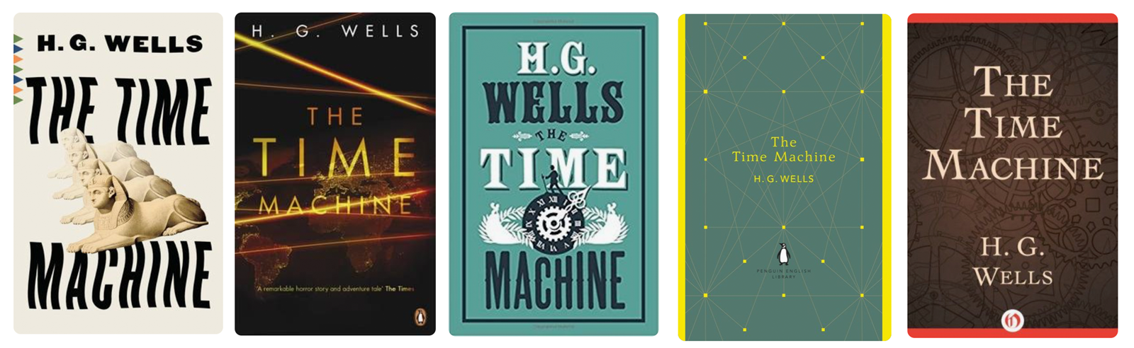 The War of the Worlds: The most obvious point to make about this selection is the dominance of the colour red, which I would suggest emphasises the overall theme of danger and threat of this story. The tripod fighting machine features in four of the designs, the first three being quite simplistic, bold silhouettes – I wanted to incorporate the use of vector illustrations into my designs, so these were important to have as reference points.The fifth design is more stylised and reflects the period in which the book was written. I chose the fourth design as it was different, so stood out (and it is one of a set, as can be seen in the selections below).