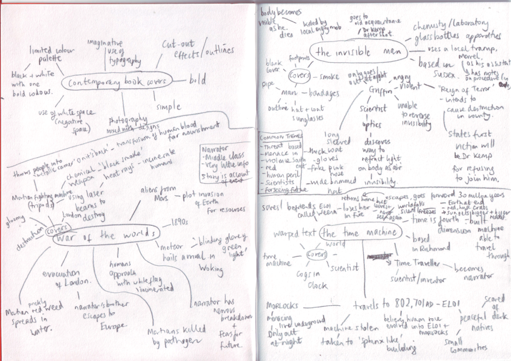 Reflecting on these techniques, it became clear that certain ones were more appropriate and practical for this exercise. As most work has a set time limit it was not very realistic to read through and digest three books to fully understand the themes, underlying meanings, historical context, etc. Therefore a summary of the story would suffice (and if this was a real brief I would expect the publisher would provide this). In this case, I had previously read both the War of the Worlds and The Invisible Man so I was familiar with the stories.
