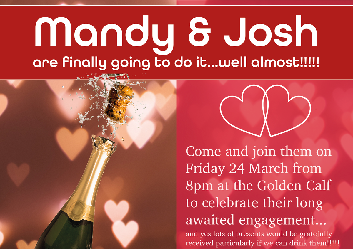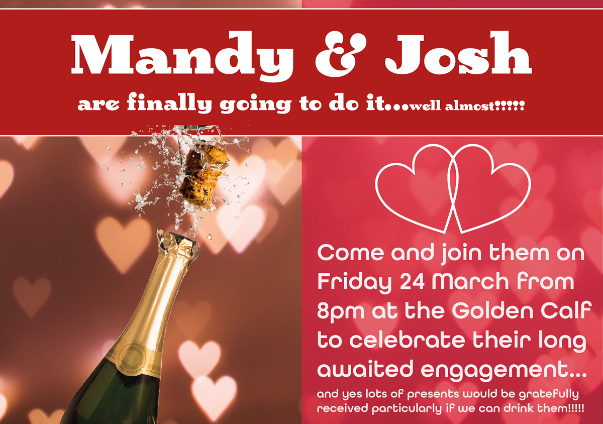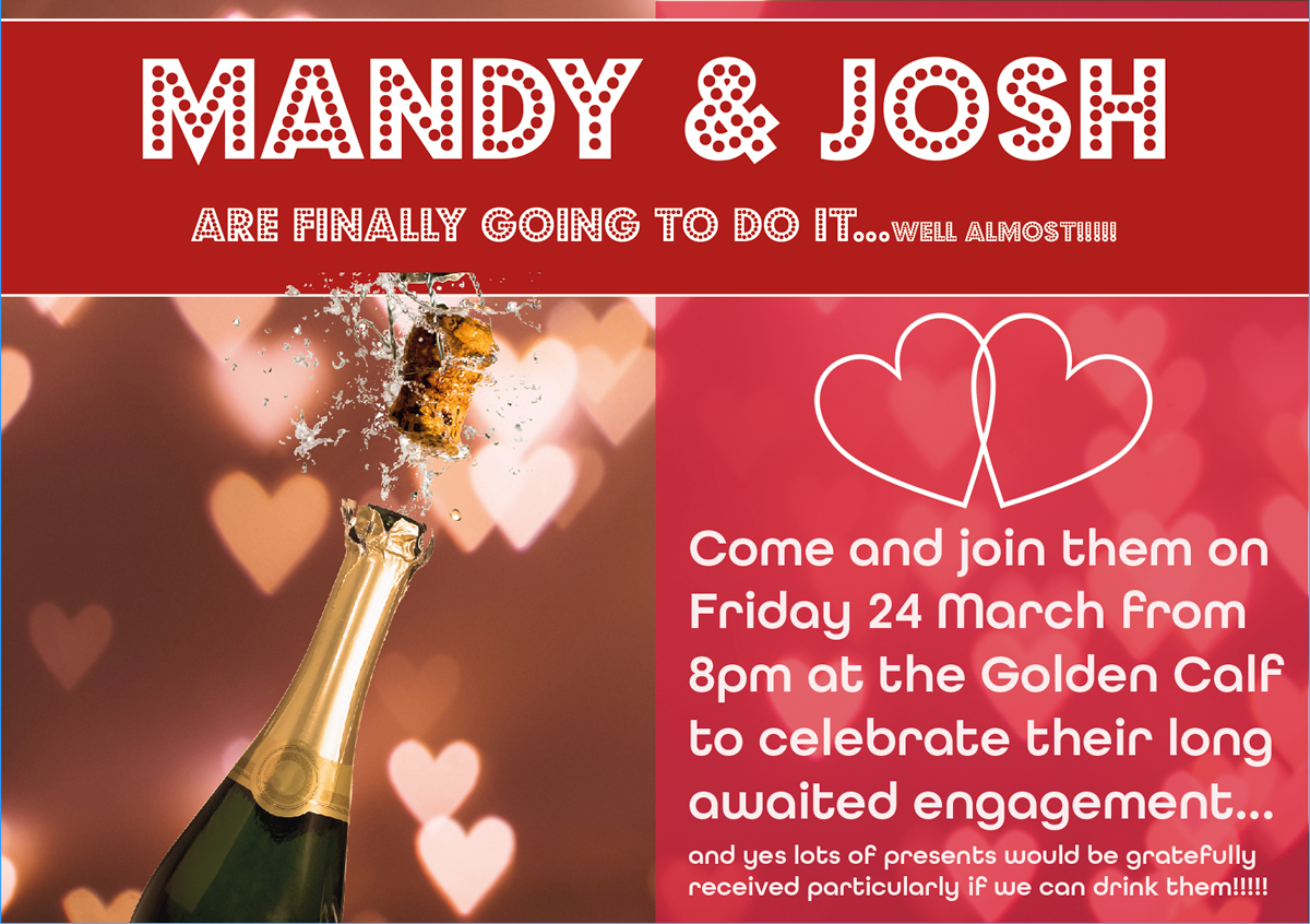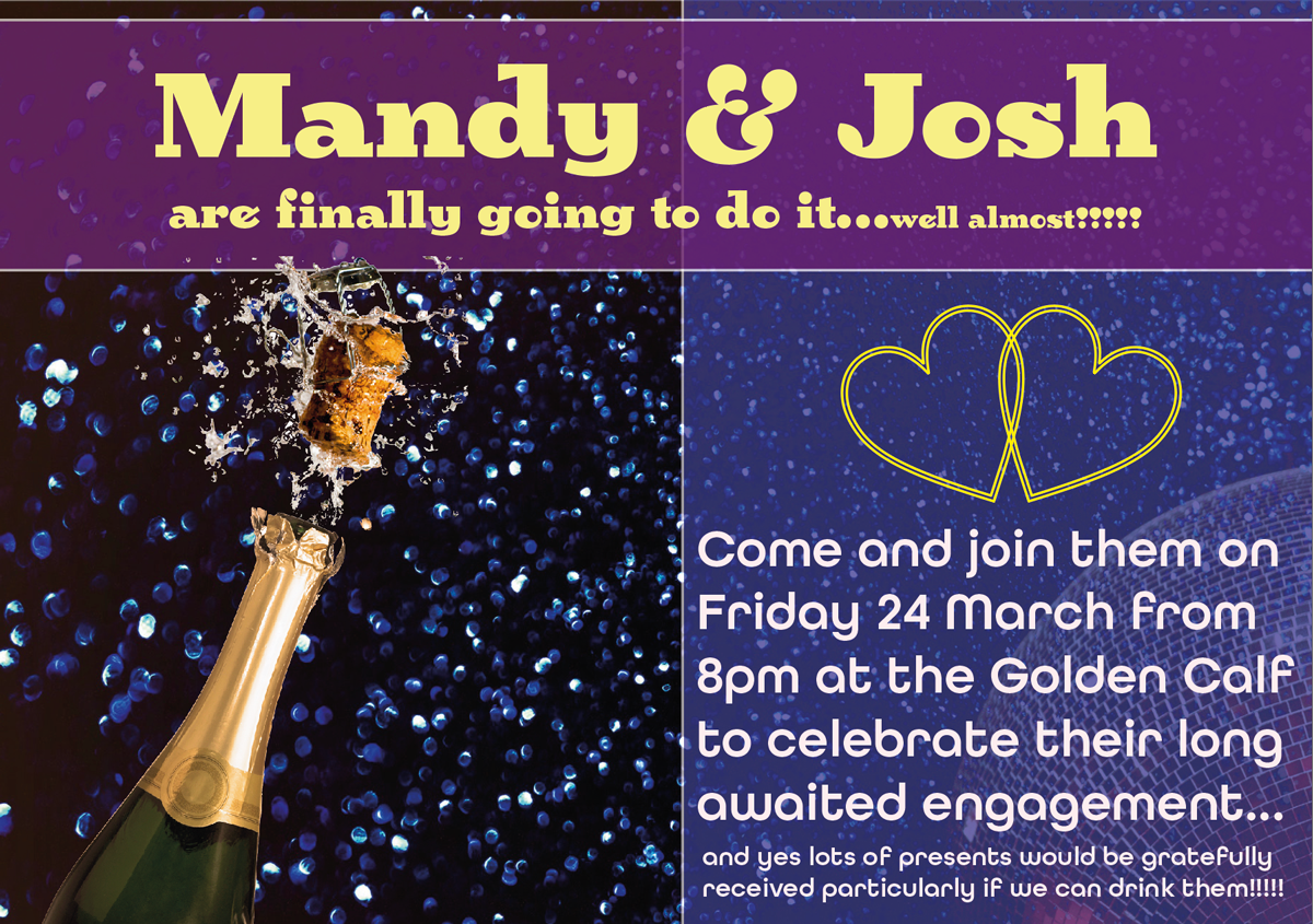 – Your friends’ engagement party (A5 flyer in style of ‘club night advert))