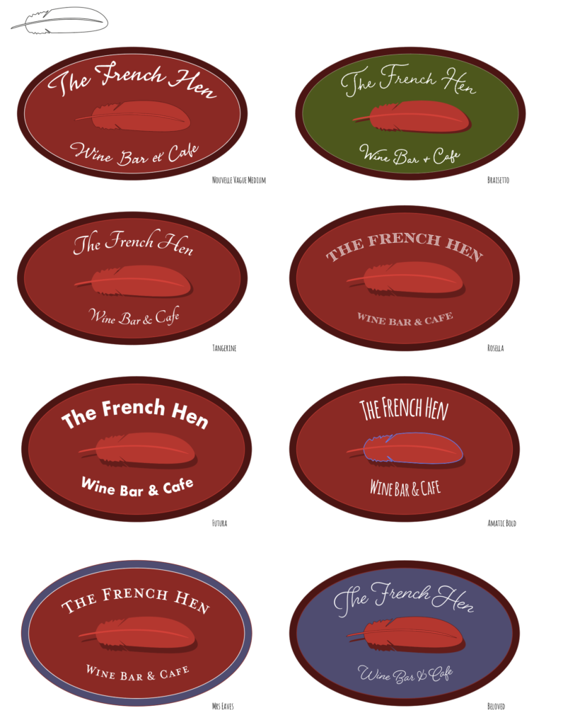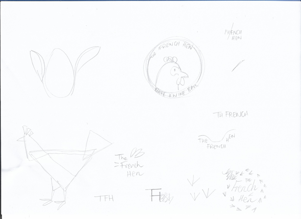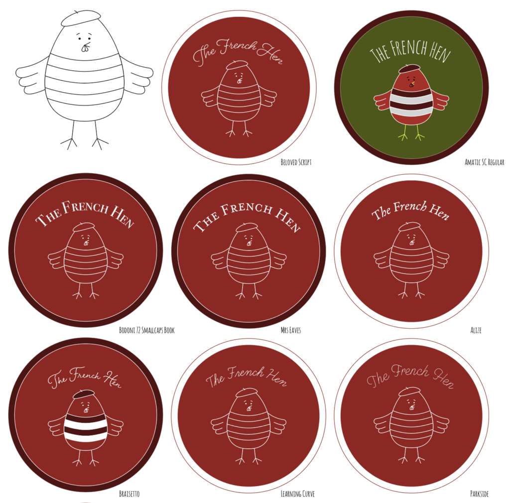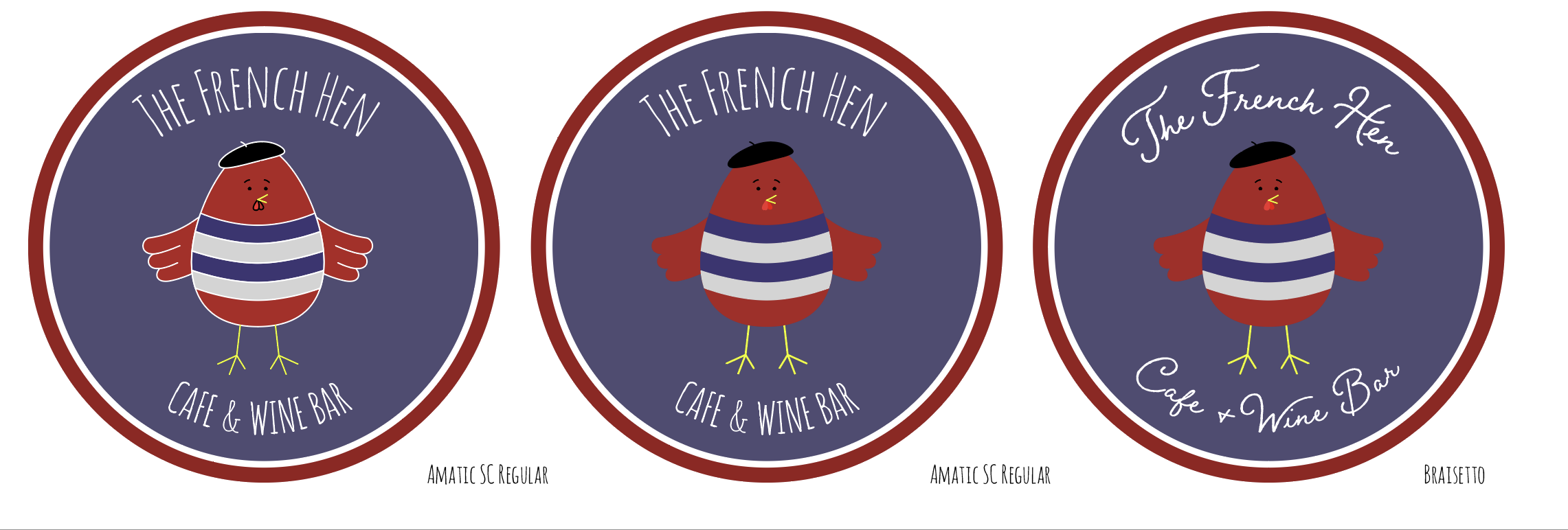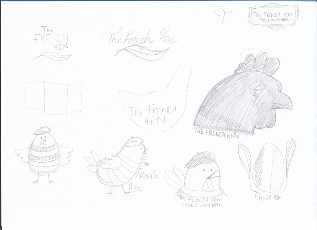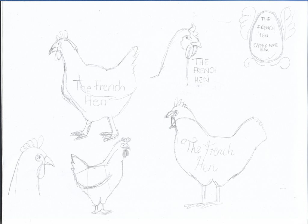 I then had a go with the character design version of a cartoon-style French Hen, mainly because I enjoy this aspect of design the most. I liked the result, but it did not really fit in with the brief as I do not think it would be considered sophisticated. It probably would be better suited to a family cafe or something aimed at children.